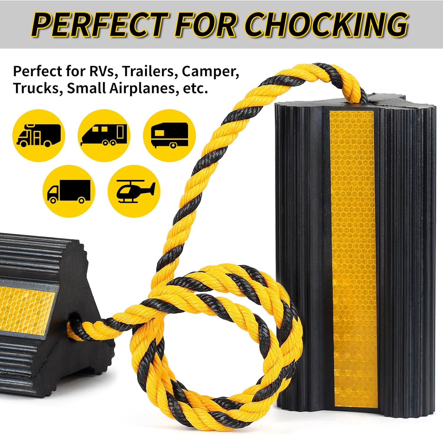 Heavy Duty Rubber Wheel Chocks, 2 Pair, Non-Slip Tire Stopper Blocks with Rope, for RV Camper Travel Trailers Motorhome Aircraft Car Truck