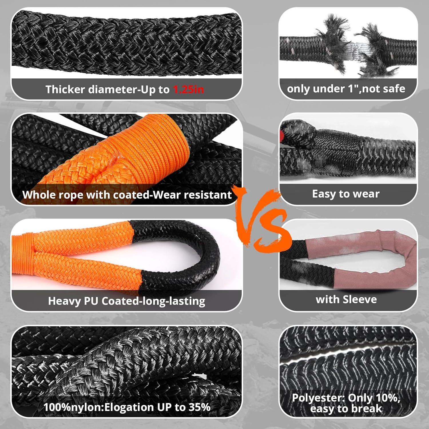 - Enhanced Heavy-Duty Towing Gear: 1 INCH UPGRADED TO 1.26 INCHES, our ultimate recovery rope turn to sturdier and stronger. Lab tested and certified up to 55000LBS breaking strength, outperforms wire winch ropes by 45%.Stretch and store 4x more energy than a tow strap, efficiently recovers vehicles of all sizes including Jeeps, off-roader, SUVs, boats, ATVs, trucks, trailer recovery/towing/snatch straps, tractors, pickups, farming, tree savers, and sport-utility vehicles,etc