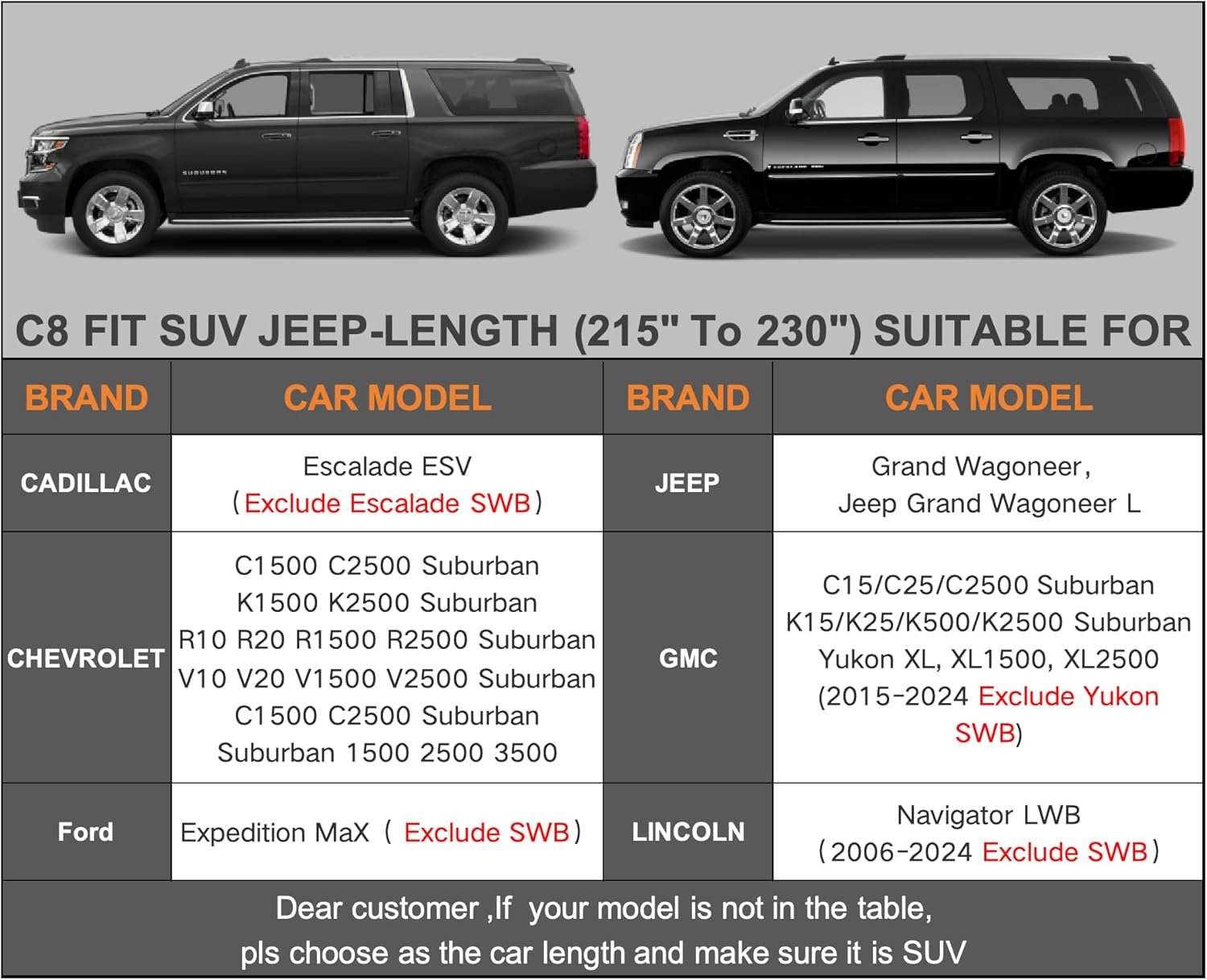 - ăDimension C8ăUniversal fit for Suv which length is 215-230 inch (Not for hatchback and sedan). Suitable for Chevrolet Chevy Suburban, GMC Yukon XL, Lincoln Navigator LWB etc.
