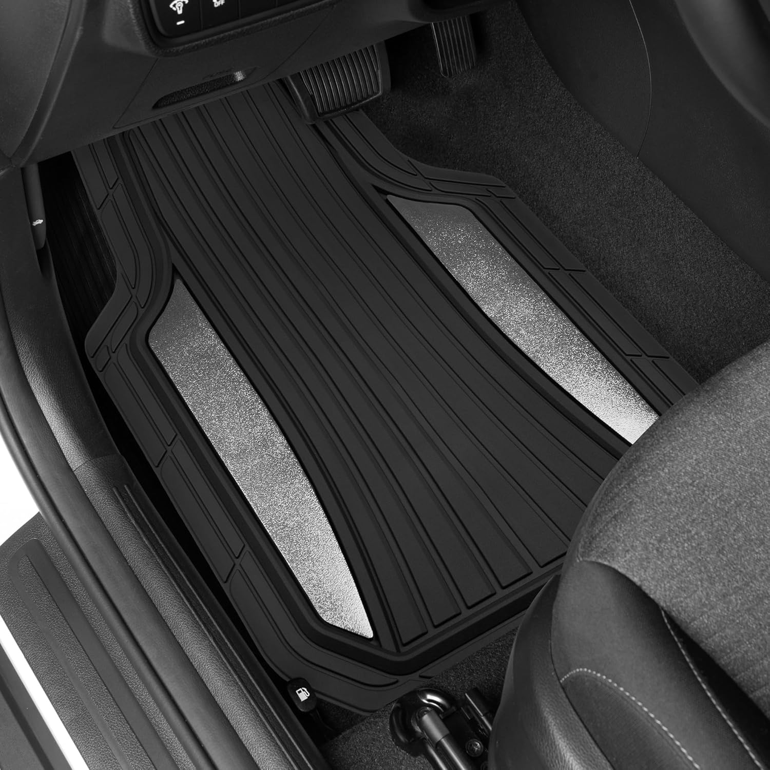- STYLISH TWO-TONE DESIGN – These car mats full set feature a sleek black and chrome-tech finish that adds a sporty look to your vehicle. Perfect for those upgrading their car accessories for men, women, or anyone who loves modern interior accessories.