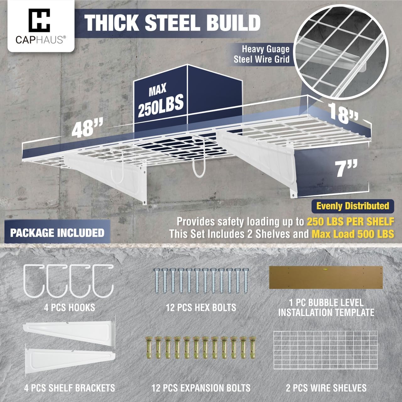 - šØ Various Size Choices - This option includes TWO wall shelves, FOUR Versatile hooks, and all necessary hardware. Each shelf measures 48 inches in width and 18 inches in depth, providing a total of 96 inches in width. Opt for the silver hex bolt for concrete and wooden walls and choose the golden expansion bolt for secure installation on brick walls. Heavy gauge steel construction provides safety loading up to 250lbs total per shelf, this set providing a total weight capacity of 500 lbs.
