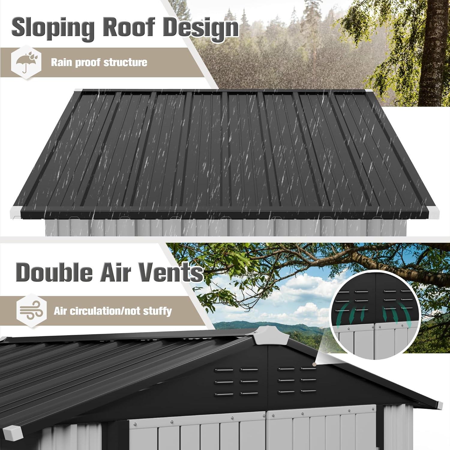 - Rainproof roof and locking doors: The roof is scientifically pitched to prevent the infiltration and accumulation of rain and snow, and lockable doors can deter animals and thieves from entering, Ensure the safety of your items and your privacy.