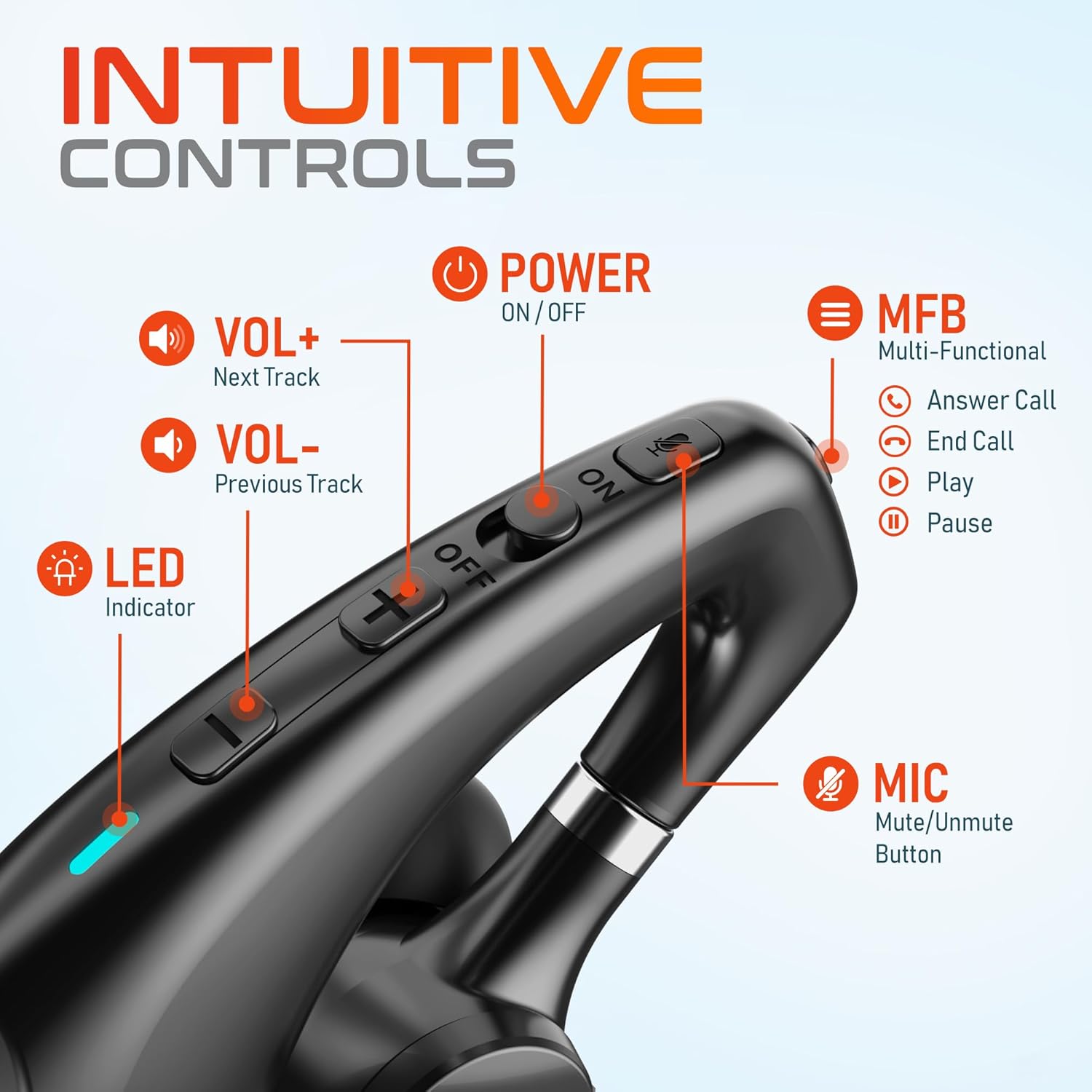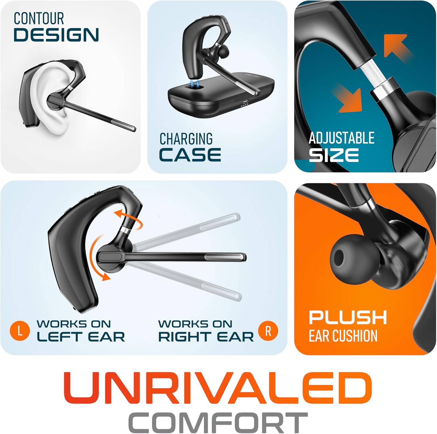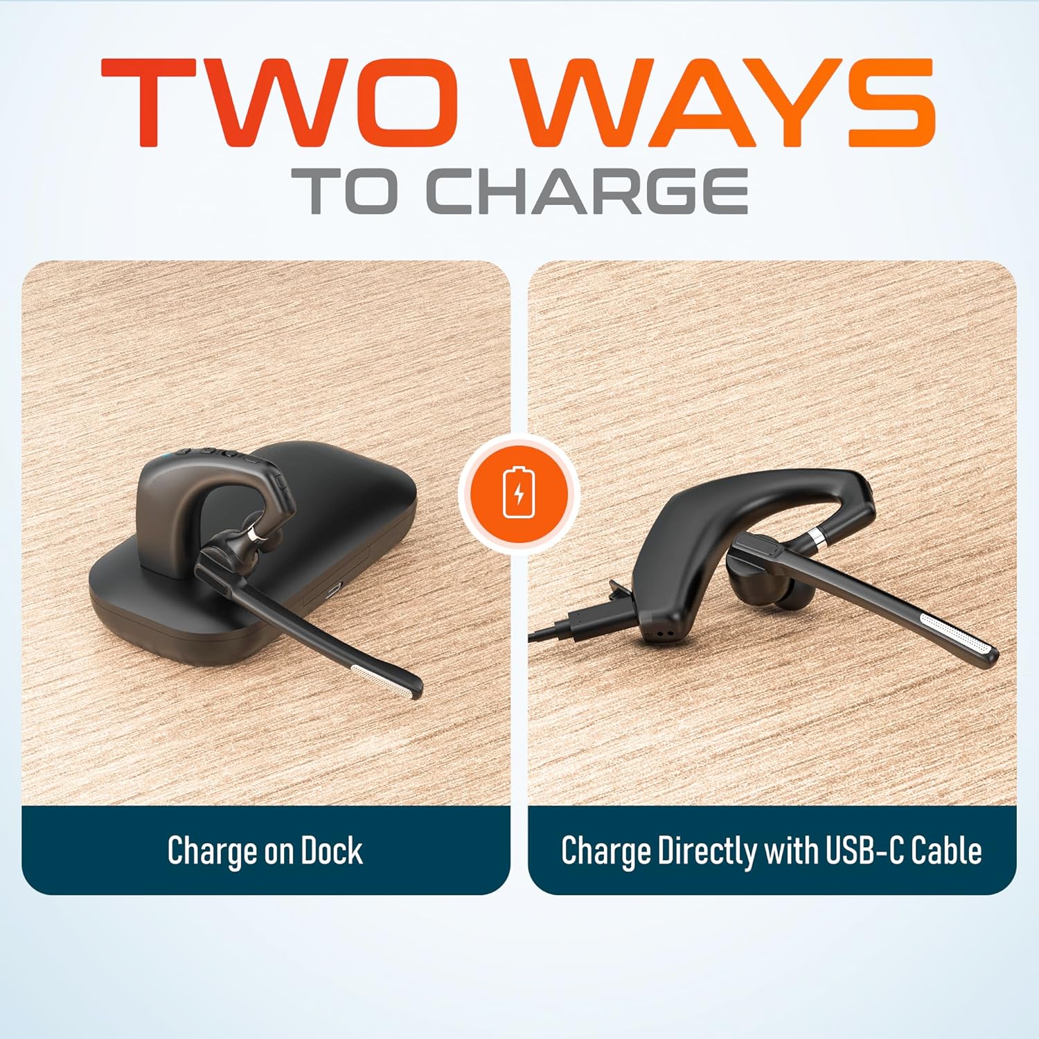 - Effortless Control and Versatile Charging Options: This bluetooth earpiece boasts intuitive controls, including volume adjustment, power toggling, mic muting, and a multi-functional button for seamless operation on Microsoft Teams and other platforms. Our wireless noise cancelling headset with mic offers two-way charging, which allows you to charge with the case or directly through a USB-C cable, catering to the dynamic needs of modern professionals.