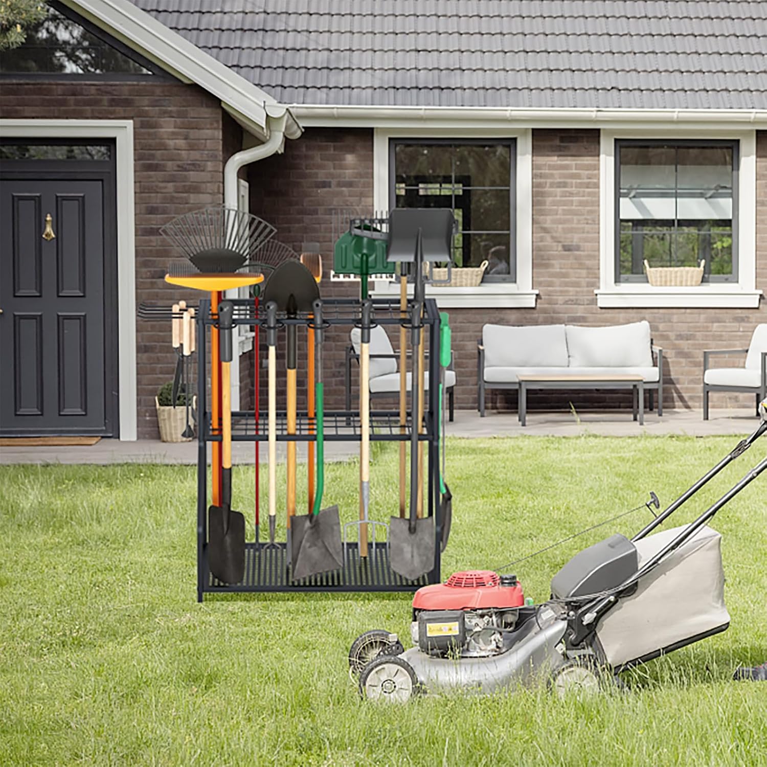- 【INNOVATIVE DESIGN】Our garden tool storage rack adopts a grid rack, which can easily store tools with long and short handles in separate compartments. The steel layer at the bottom greatly enhances the load-bearing capacity of the tool rack, allowing you to place heavy items such as seeds, soil, fertilizers, etc.