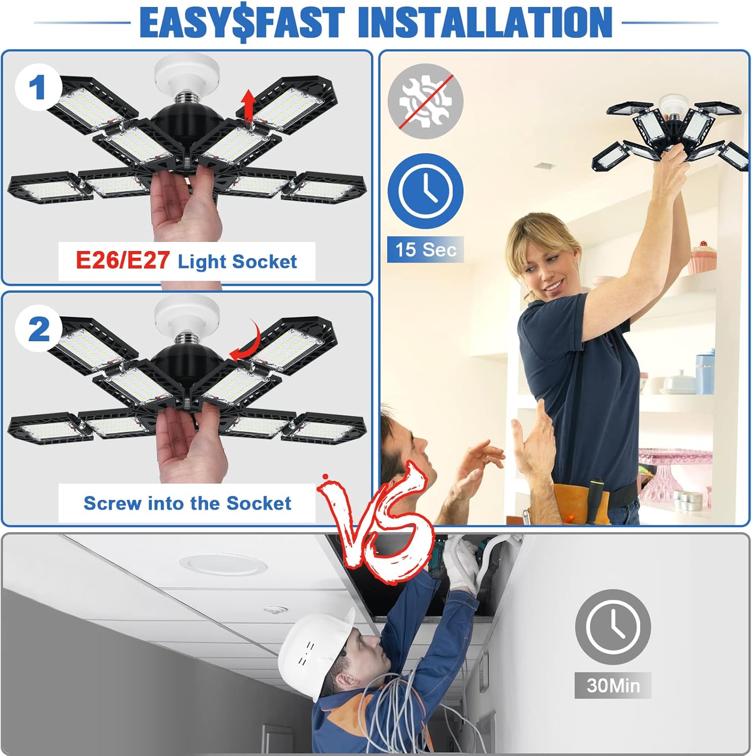 - 【Safety & Energy Saving】Upgraded Garage Lighting Bulb is made of high quality aluminum heatsink and each panel features a unique hollow-out design that make a better heat dissipation. Make lifespan more than 50000 hours , and equivalent to 6 traditional light bulbs, more than 85% energy saving than traditional lamp.