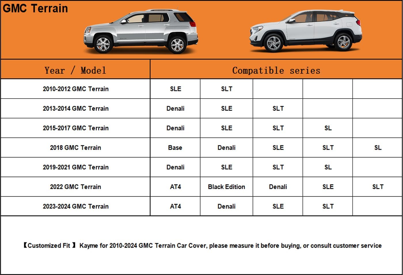 - ăSuitable forăâ Custom fit for GMC Terrain (2010-2025). Come with a large enough portable bag to store your cover when you do not use
