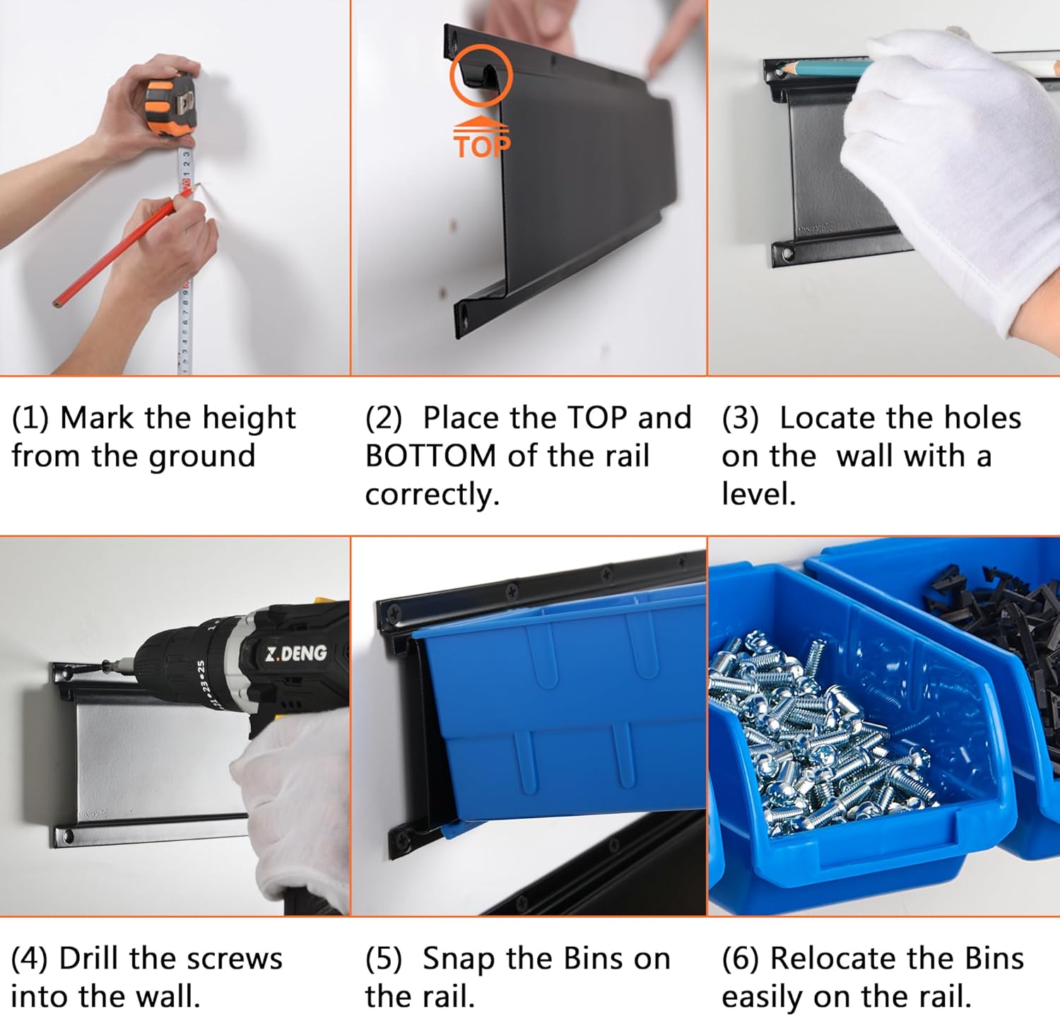- OPEN DESIGN & EASY TO INSTALL - The lid-free, open design makes it easy to see whatβs inside each compartment and also keeps your parts and hardware readily accessible. With 3 rails mounted on the wall, the bins can snap on the rails easily.