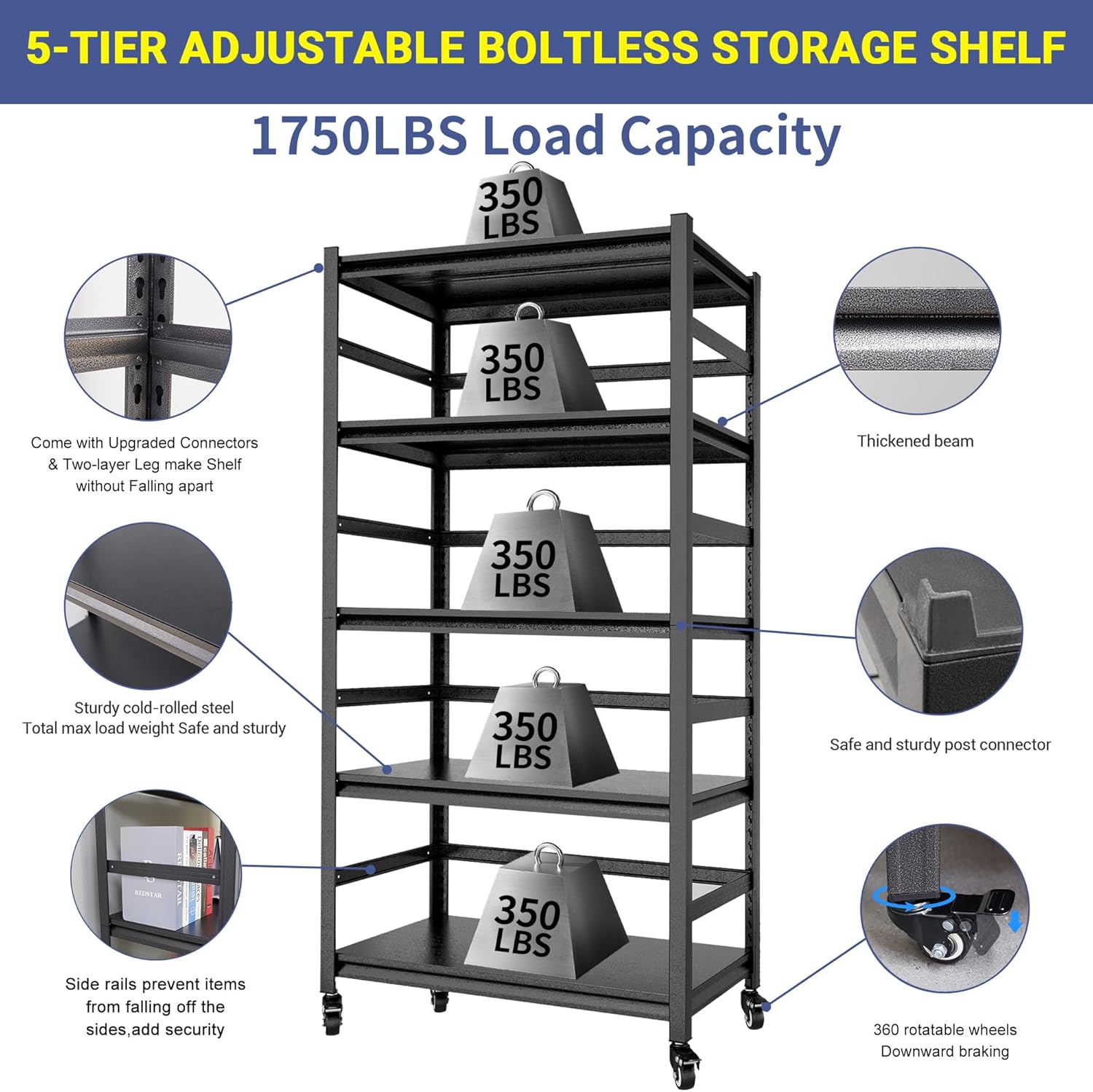 - ă1750LBS Load Capacityă: Our 5-Tier utility shelves are made of the high-quality metal frame, each shelf is built with thick steel. The maximum capacity of the industrial garage storage Shelf is up to 1750lbs totally, 350lbs per shelf, providing reliable support to store much more stuff and tools in your garage or warehouse.
