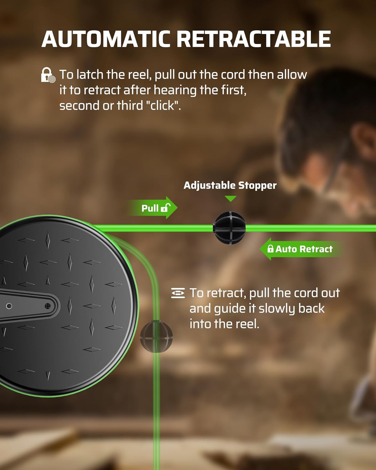 - [Automatic Ratcheting System] With a clever auto-guide rewind mechanism to avoid kinks and tangles, the SJTW extension cord winder will retract quickly and smoothly, also comes with a flexible stopper to adjust the length of cord and prevent the retractor from getting stuck in slot, lock the cord at any length