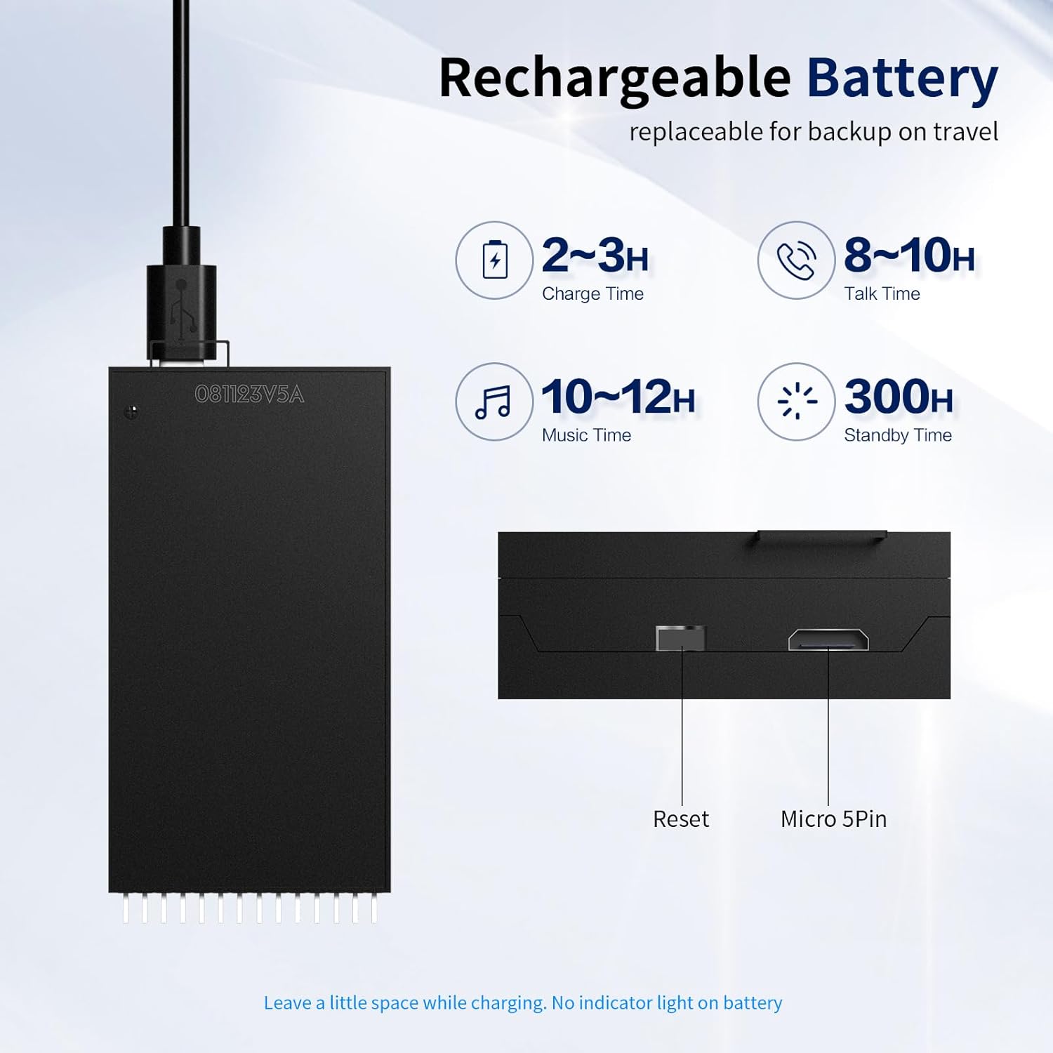 • Lithium polyer battery gives you 8-10 hours continuous song and talk, standby 300 hours. To prolong the service life of battery, please charge it regularly 1 time a month at least, do not plug it in completely while charging. If you don't use Bluetooth system for long time, battery may enter deep sleep. Just charge it about half an hour, unplug, wait half an hour and charge again to wake it up.