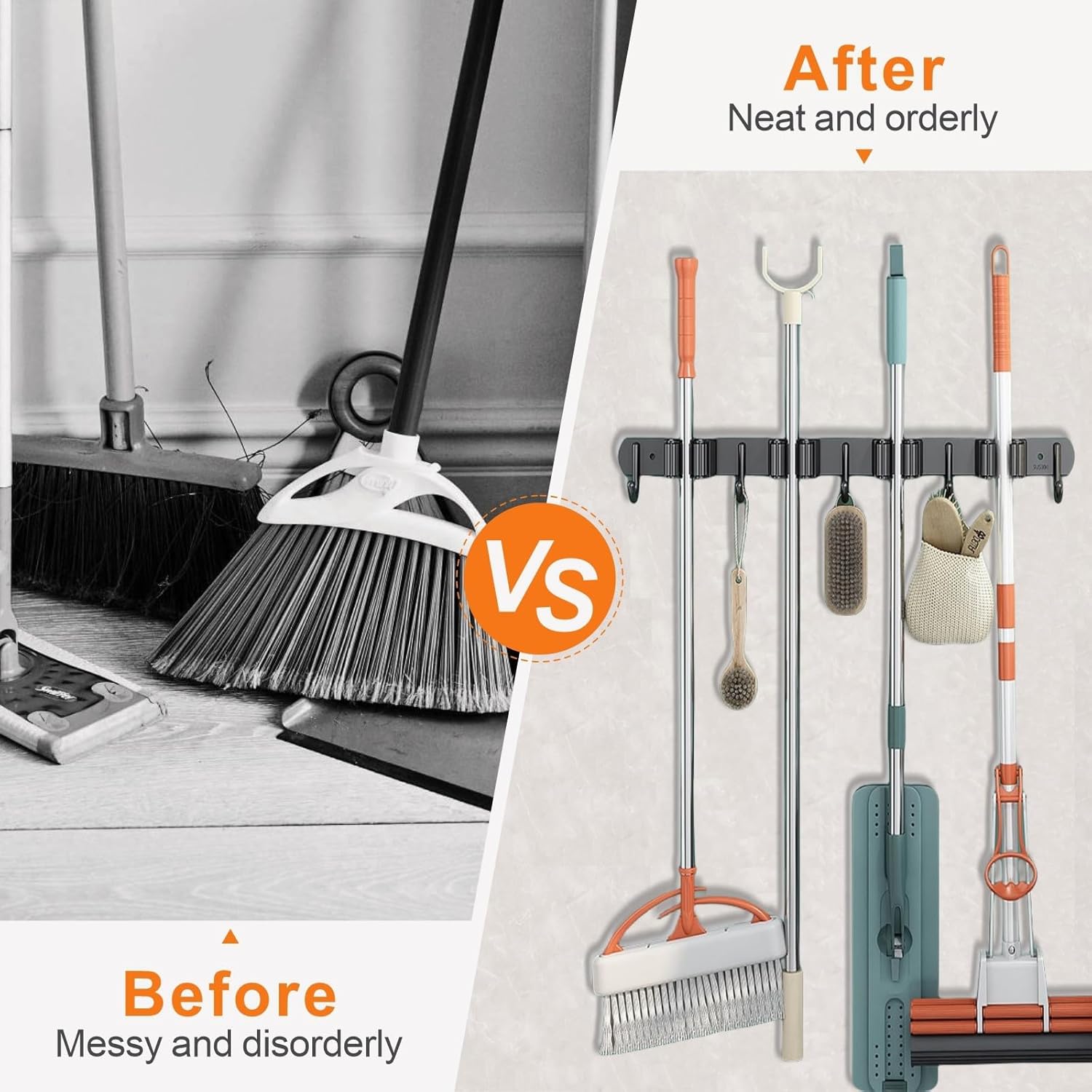 - EASY TO INSTALL: You can easily install the broom and mop organizer wall hanging in just a few minutes! The broom hanger wall mount is ideal for kitchen, bathroom, garage, laundry, broom closet, garden