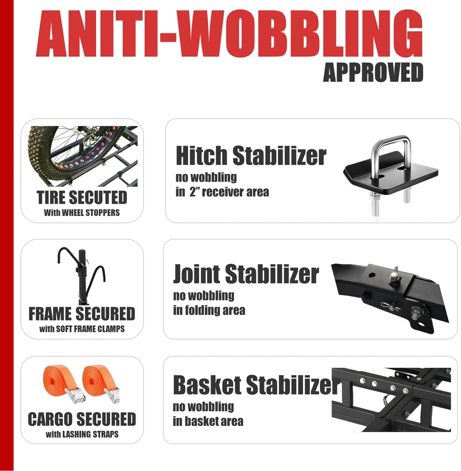- STURDILY BUILT & EASY USE: Treated to resist rust and corrosion, this hitch cargo bike rack withstands tough weather conditions. The foldable design saves space and makes parking easy when not in use