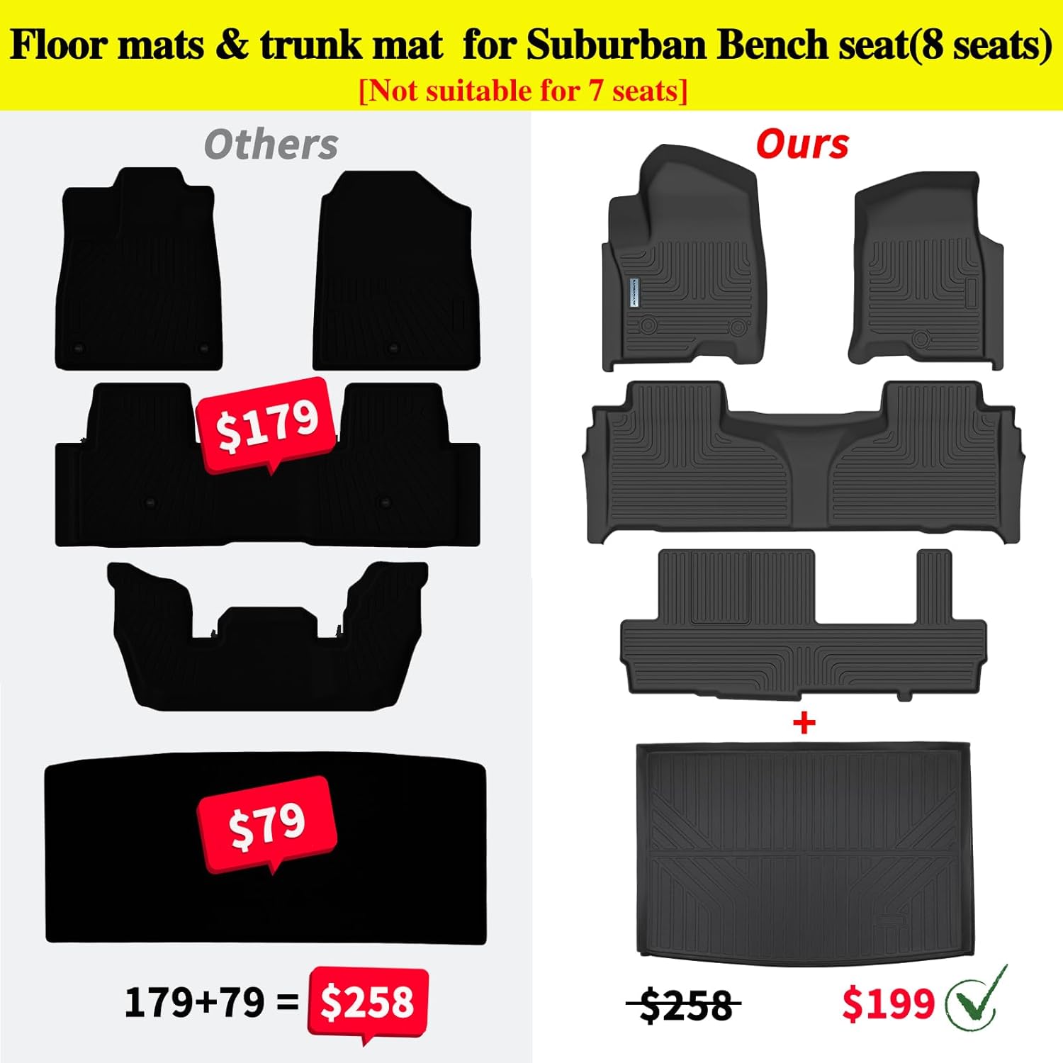Floor Mats & Trunk mat for 2021-2024 2025 Chevrolet Suburban 8 Seats with 2nd Row Bench Seats(not fit 7 Seats)/GMC Yukon(Only Fit XL),TPE Floor Liners & Trunk mat for Chevy Suburban
