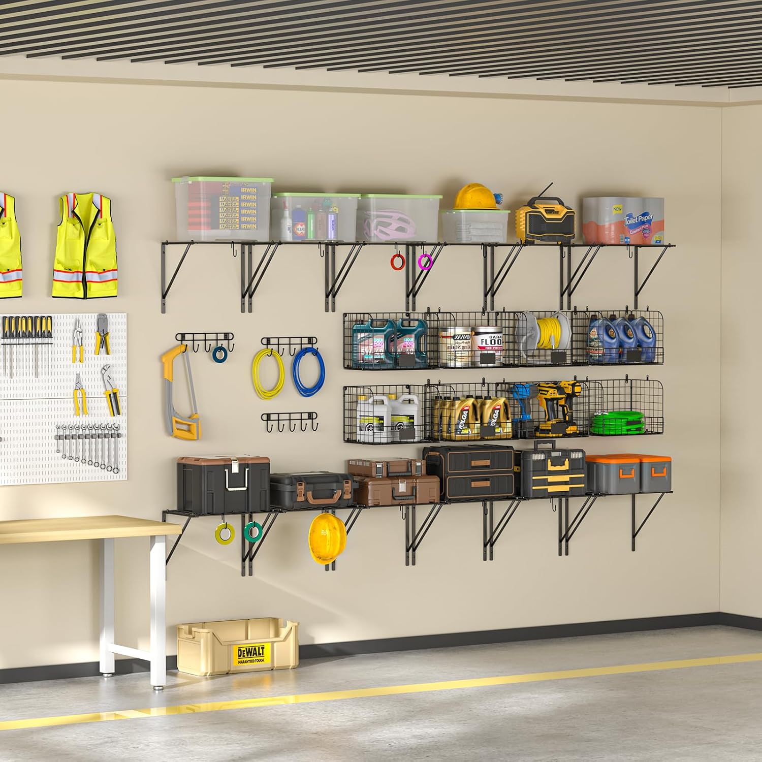 • LARGE STORAGE CAPACITY: The package includes 2 shelves, 2 wire baskets, 2 hook racks, and 4 hooks. This unique storage combination has a large enough capacity to store a lot of garage supplies. Making full use of this shelving capacity to make your home look cleaner and tidier.