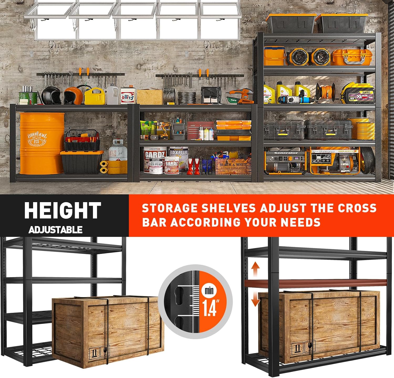 - ăAdjustable Storage Shelves to Meet Different NeedsăYou can use your imagination to customize your own space. Metal shelves for storage is designed with adjustable connectors. The height of each layer is not only adjustable by moving the crossbar meet the different heights of needed, but also the shelf can be assembled or disassembled into several different metal shelving. Two garage shelf can be used as workbench can be used for garage