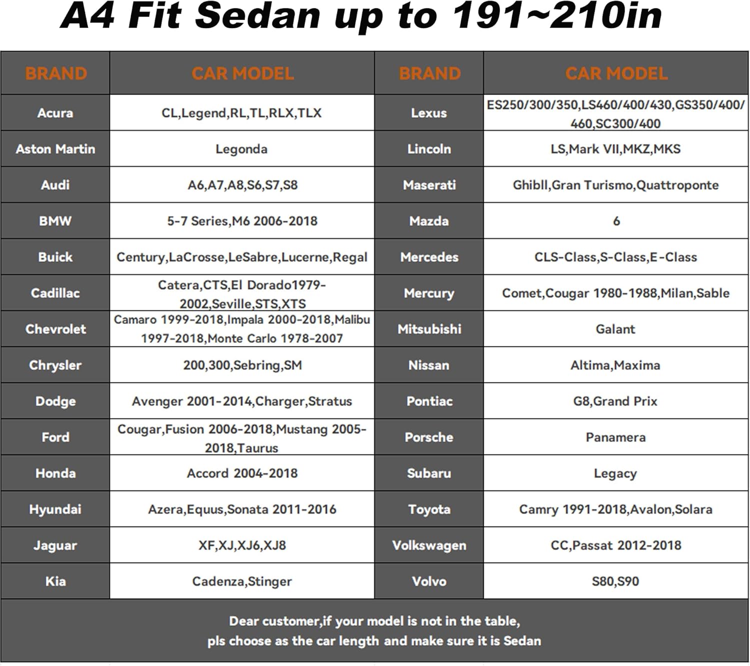 - Choose the right size - This sedan car cover measures 210" L X 78" W X 59" H.See the product images for applicable vehicle models.Please check the car details before you order the auto cover. 1.Check your car model:Sedan or SUV?2.Measure your car length.We offer one-year warranty,If you are not sure which size to choose or have any questions on our item, feel free to contact us.