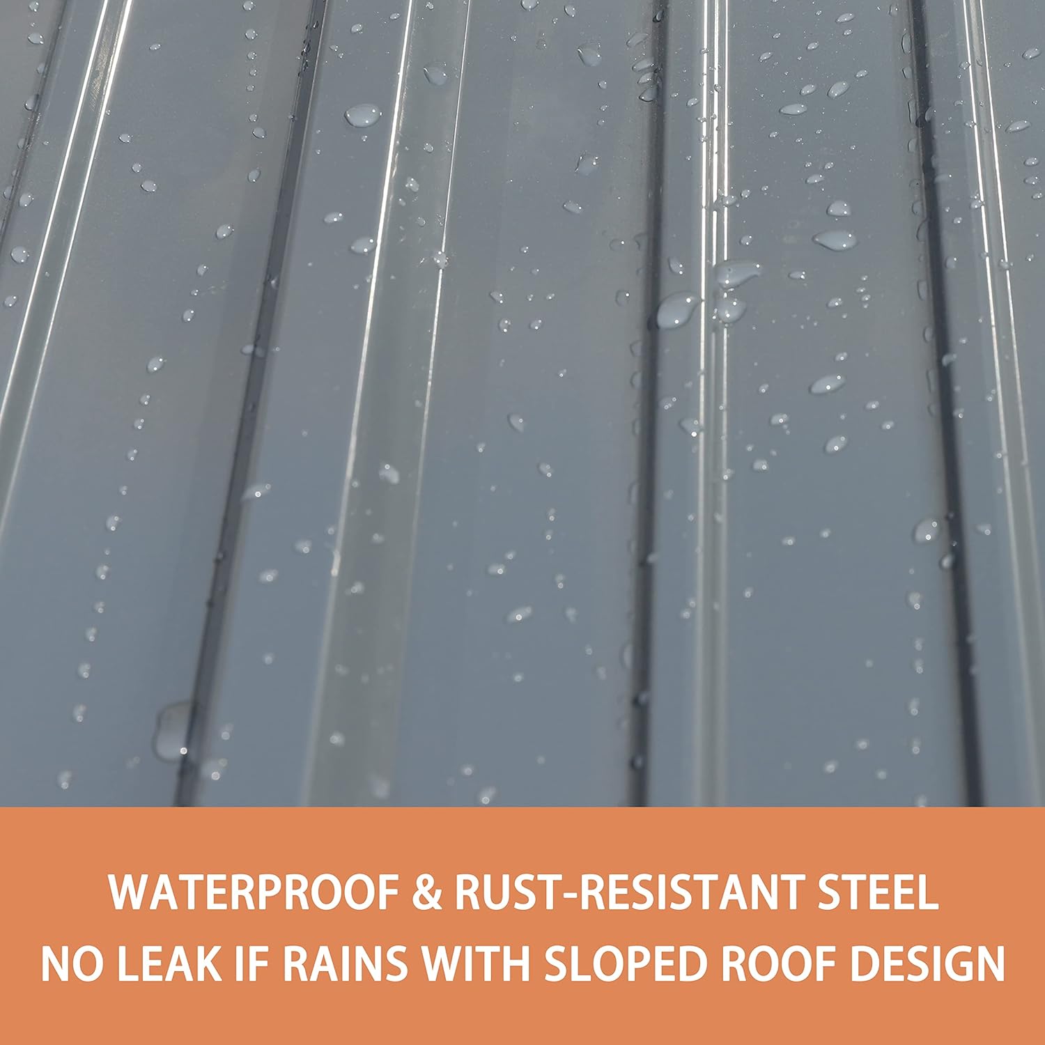 - Upgraded, Thicker, Stronger - We upgraded the thickness of the galvanized steel in the storage shed to 0.012". This storage shed is designed to withstand kinds of weather conditions, making it suited for outdoor use. And firm doors with a lock provide a layer of security for your belongings.