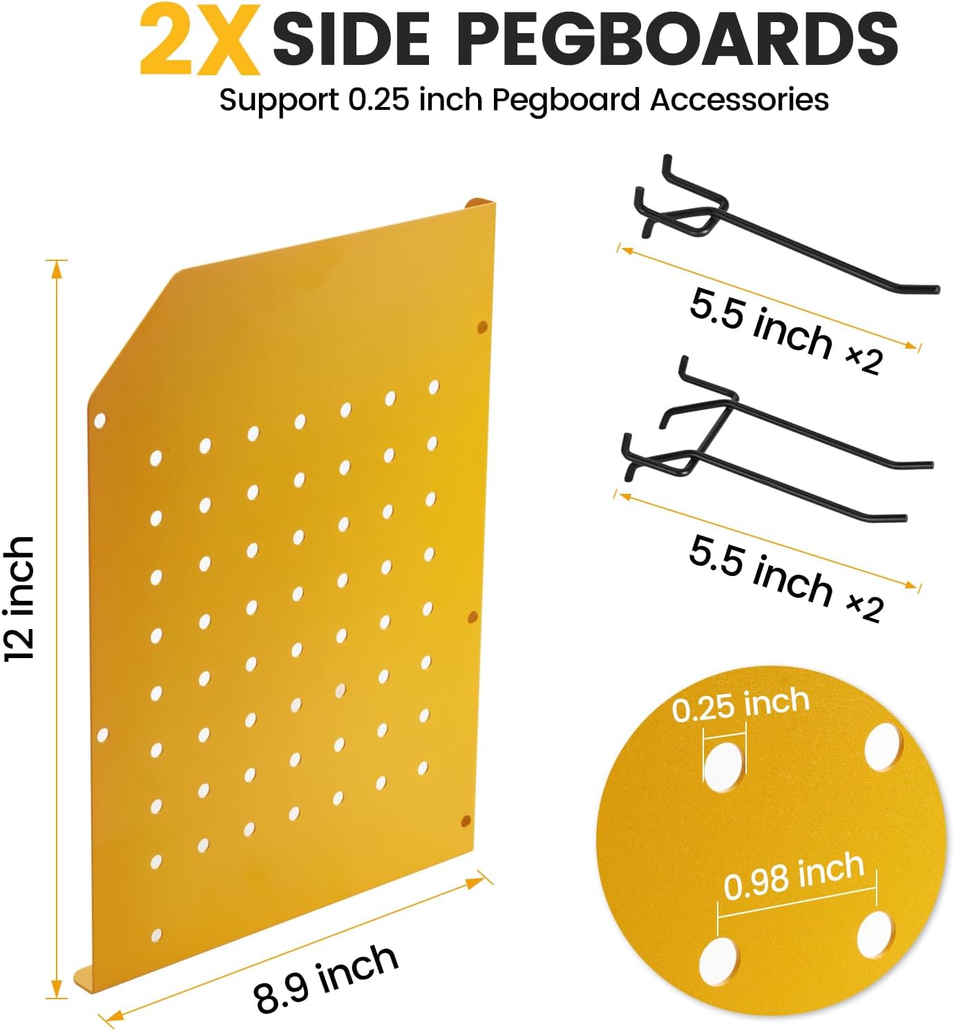 - Versatile Side Pegboards: Size 12"H×8.9"D, hang garage tools on pegboards with 4 included hooks, supports 0.25" pegboard accessories for DIY customization to increase storage space, improves load capacity and stability of the power tool rack