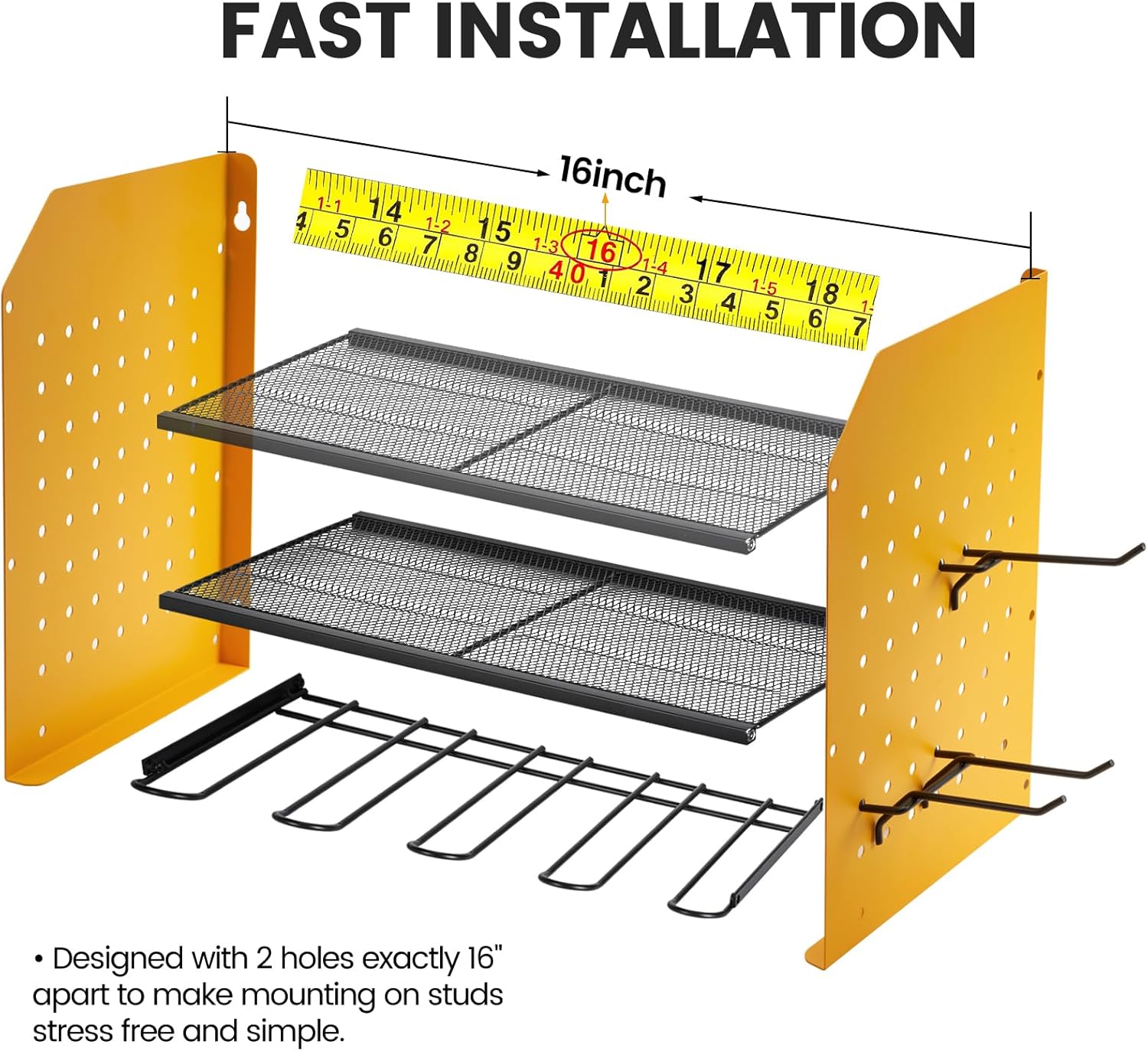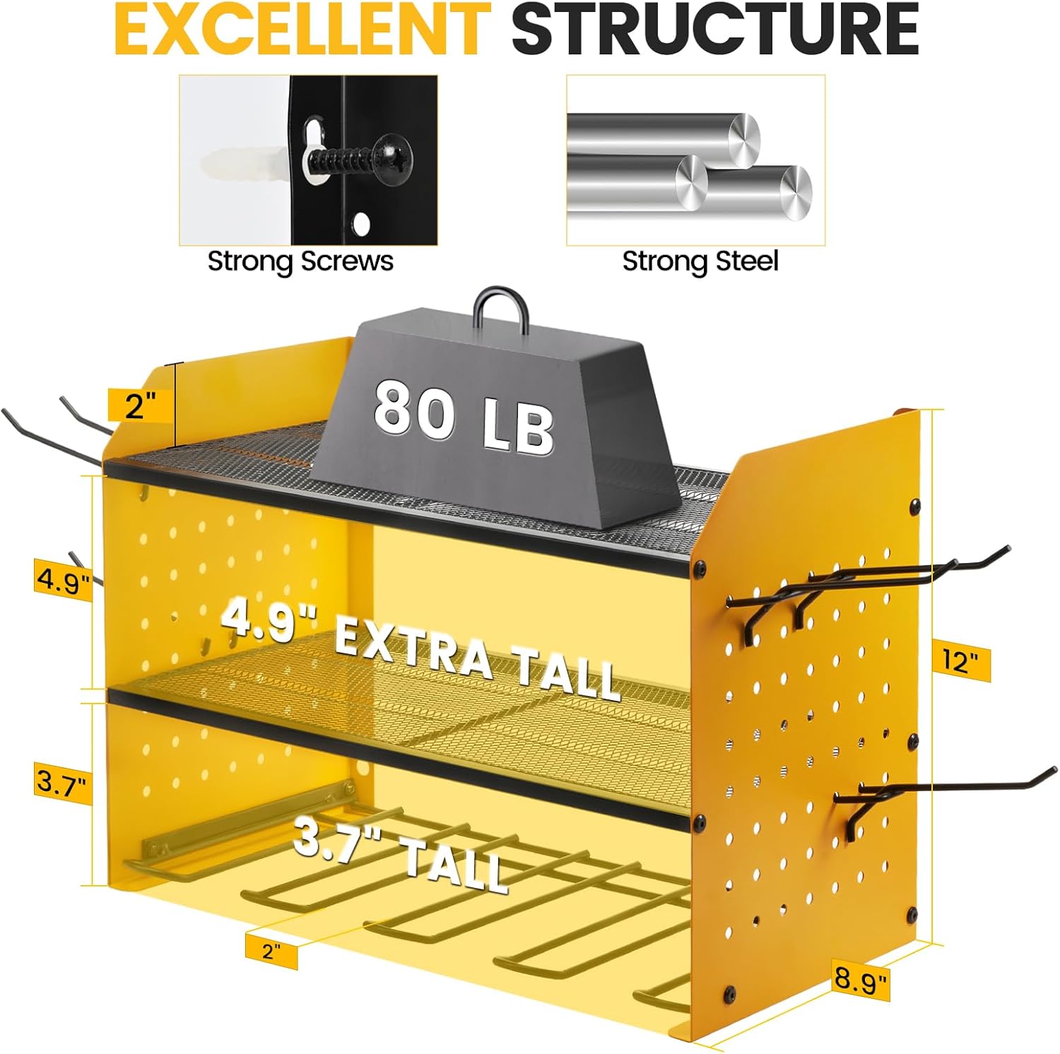 - 3-Layer Efficient Storage: Top layer 16"L×8.9"D for high cans, batteries; middle layer 16"L×8.9"D×4.9"H for toolboxes, power tools; bottom layer for 4 cordless drills; side pegboards with 4 hooks support 0.25" accessories for DIY storage