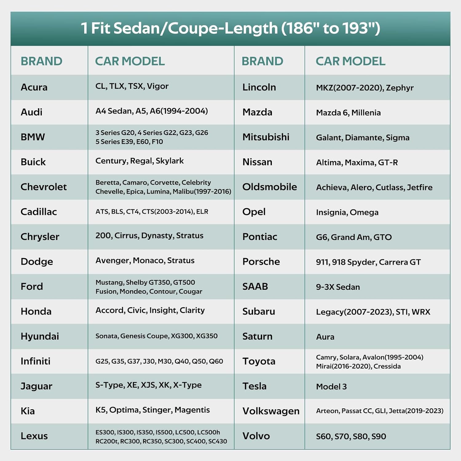 - ăCHOOSE THE RIGHT MODELă: Molebt car cover fits Sedan & coupe 186 to 193 inch. For example Ford Mustang, Chevy Camaro, Chevelle Corvette C3 C4 C5 C6 C7 C8, Toyota Camry, Honda Accord/Civic, Kia Optima/K5/Stinger, Volvo S60, Nissan Altima/Maxima, Hyundai Sonata, Ford Fusion, Lexus ES350, Volkswagen Passat, Infiniti G35/G37, Tesla Model 3.
