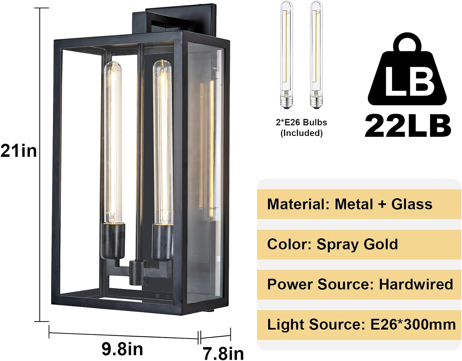 - 🥇LARGE GREAT PORCH LIGHT - With dimensions of 9.8"(L)*7.8"(W)*21"(H), Weight:22lb.Our outdoor light fixtures wall mount is designed to fit and decorate your home better than other 8-12"H options. Create an inviting ambiance and elevate your outdoor space with this generously sized wall light.