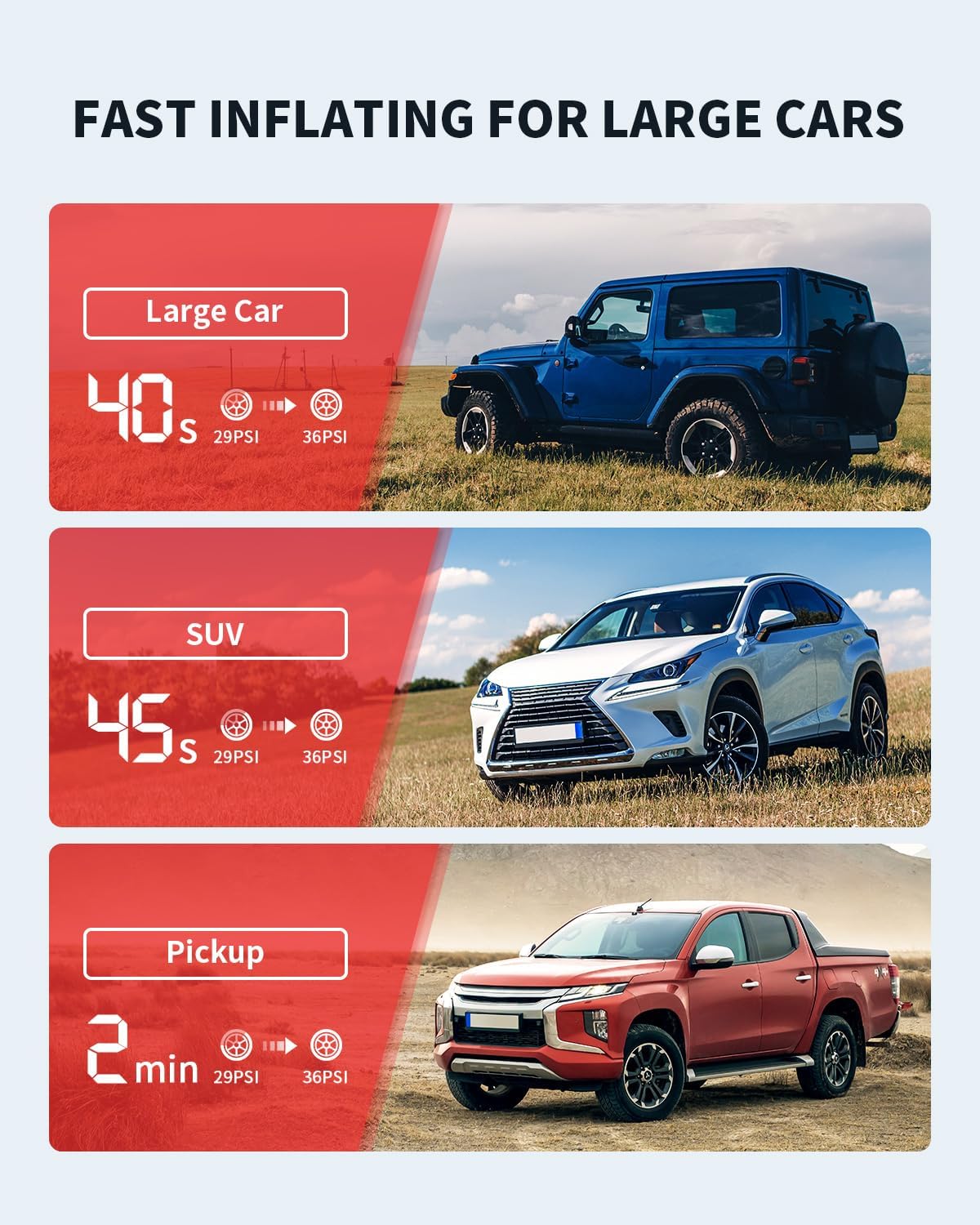 - 5X Fast Inflation: 50LPM airflow with upgraded dual cylinder and more powerful motor, this car tire inflator can quickly inflate 255/55/R20 tires from 29PSI to 36PSI in 45s! Faster solve all emergencies in road trips!