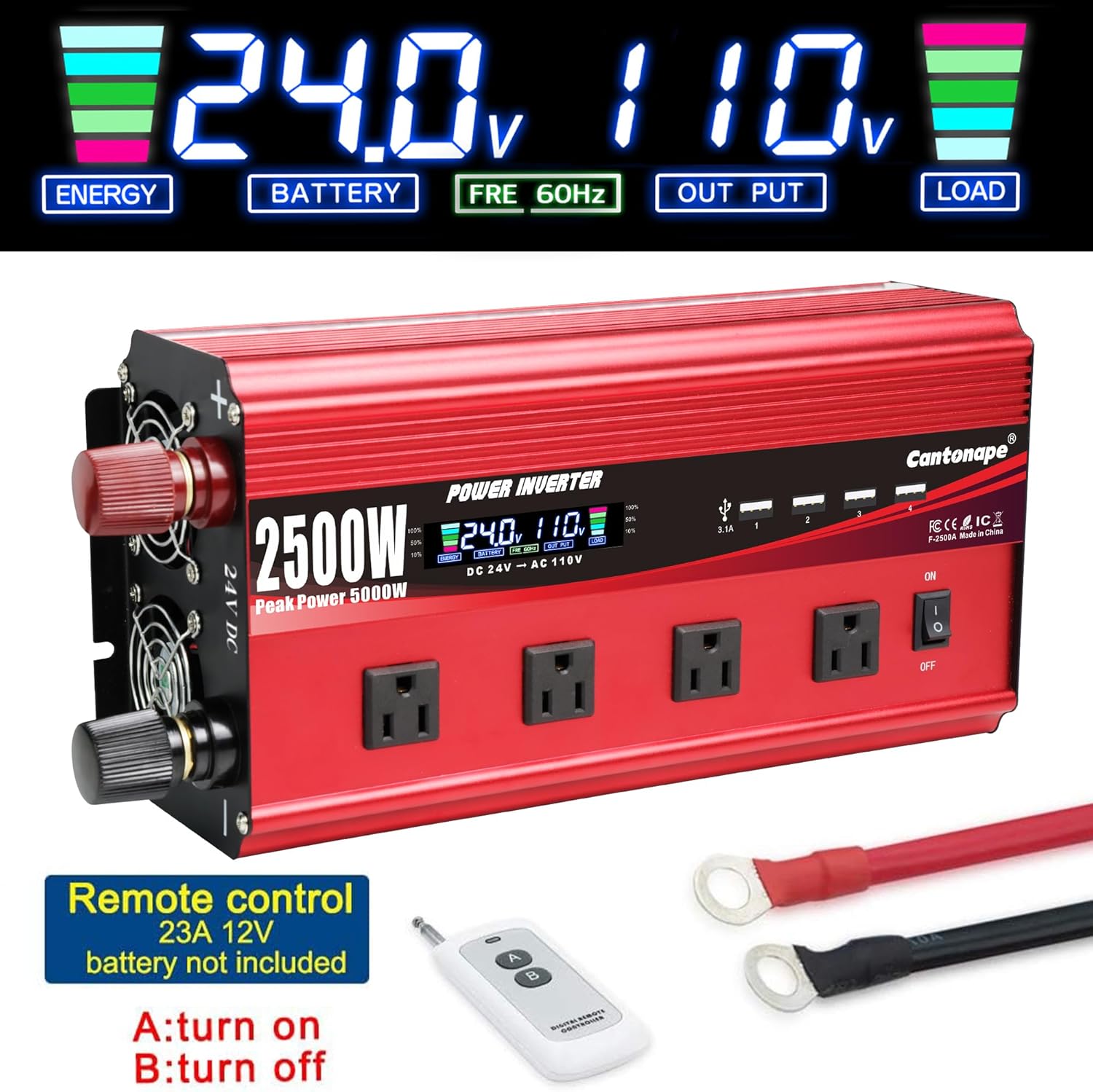 - POWERFUL OUTPUT: Convert power of DC 24V to AC 110V/120V 60Hz. Provides 2500 Watts continuous modified sine wave power and 5000 Watts surge power. Featuring 4 AC outlets and 4 USB ports for multi-purpose charging. Great High efficiency: conversion efficiency > 90%. The rated output power of this device is 2500W, it could definitely be realized in reality.