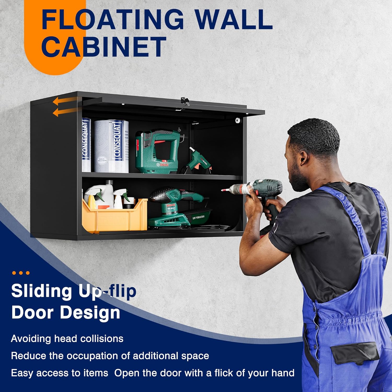 Yizosh Metal Garage Wall Cabinet with Doors and Shelves, Wall Mounted Metal Storage Cabinet, Floating Garage Tool Cabinet for Garage, Basement, Kitchen, Warehouse (Black, 21.6" H)