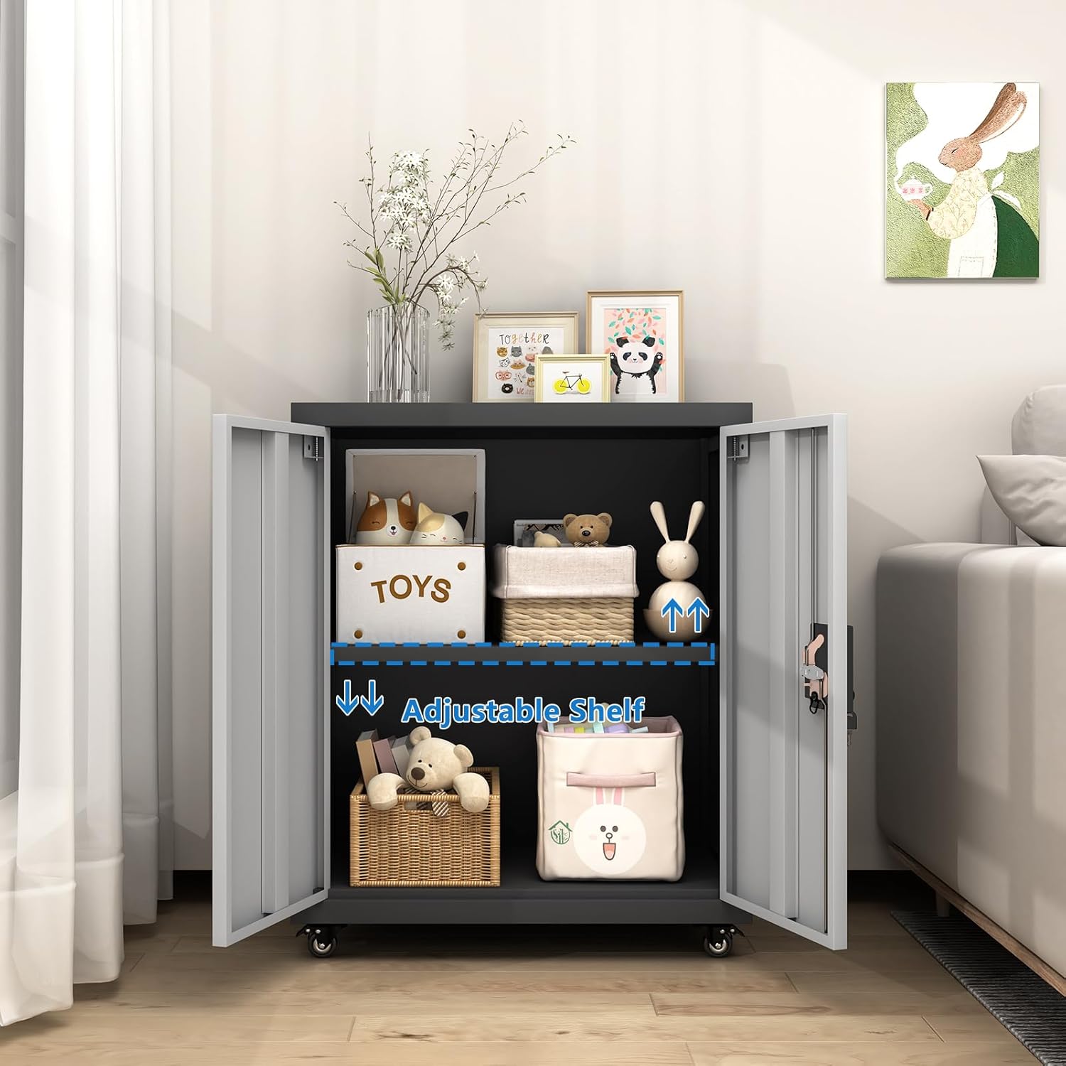 - 🔒【Lockable Door & Adjustable Shelf】This lockable storage cabinet with wheels features two doors and an adjustable shelf. The lockable doors provide a secure place for your personal items and documents. The adjustable shelf offers more options for storing items of different sizes.