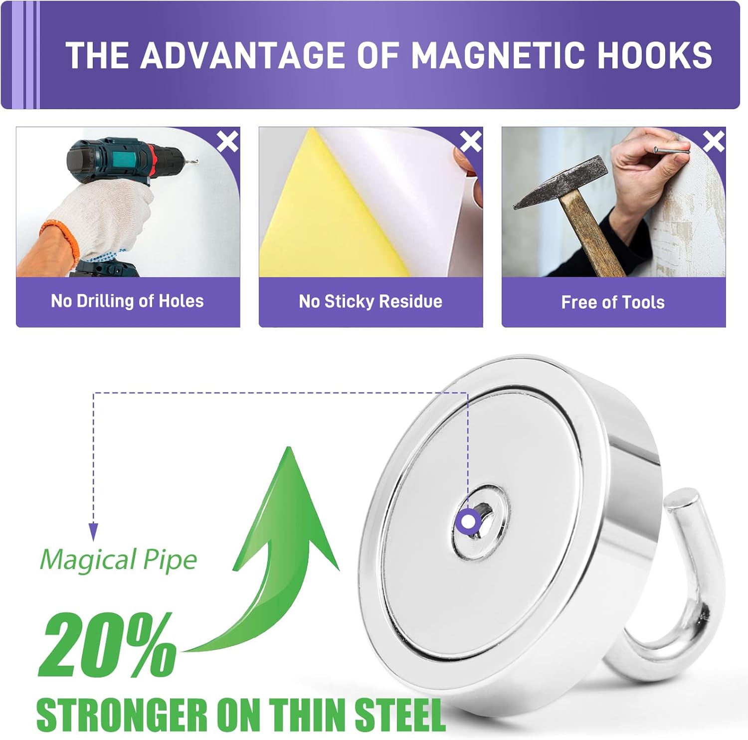 - ✔MAGIC STEEL TUBE DESIGN - Unique design of steel tube inside the base of magnetic hooks greatly increases the attractive force , especially on thin steel! It increase approximately 20% force comparing those none-tube magnets. it solves the problem of weak force on thin steel. Permanent magnetic hook with magic steel tube, strong magnetism lasts forever!