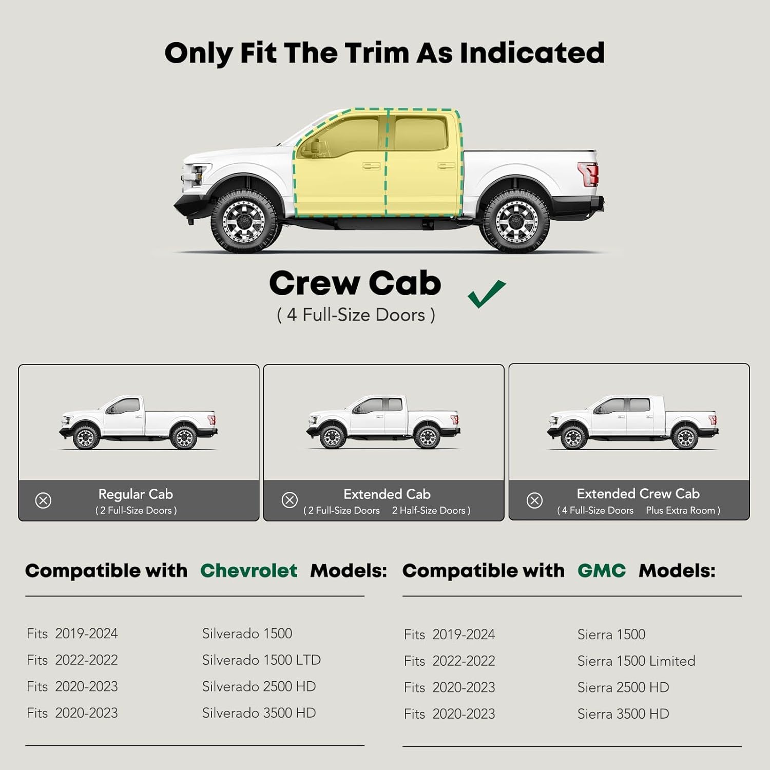 - Confident Fitment: Cab length side steps fit the Chevrolet and GMC Models: Silverado/Sierra 1500 19-24, Silverado 1500 LTD/Sierra 1500 Limited 22, Silverado/Sierra 2500 HD & 3500 HD 20-24, Crew Cab(4 Full-Size Doors), Not fit Body Lift Kit or Diesel models with DEF tanks
