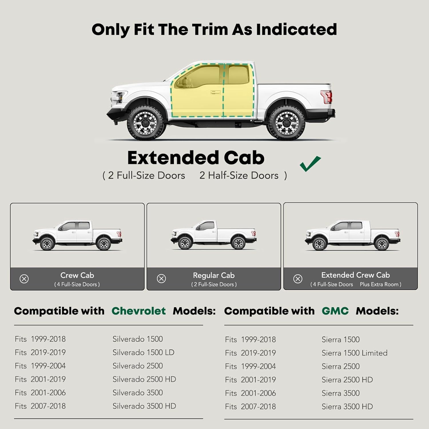 - Confident Fitment: Cab length side steps fit the Chevrolet GMC Models: Silverado/Sierra 1500 99-18, 2500 99-04, 2500 HD 01-19, 3500 01-06, 3500 HD 07-18, Silverado 1500 LD/Sierra 1500 Limited 19, Extended Cab(2 Full-Size Doors with Half Doors), Excluding C/K Classic