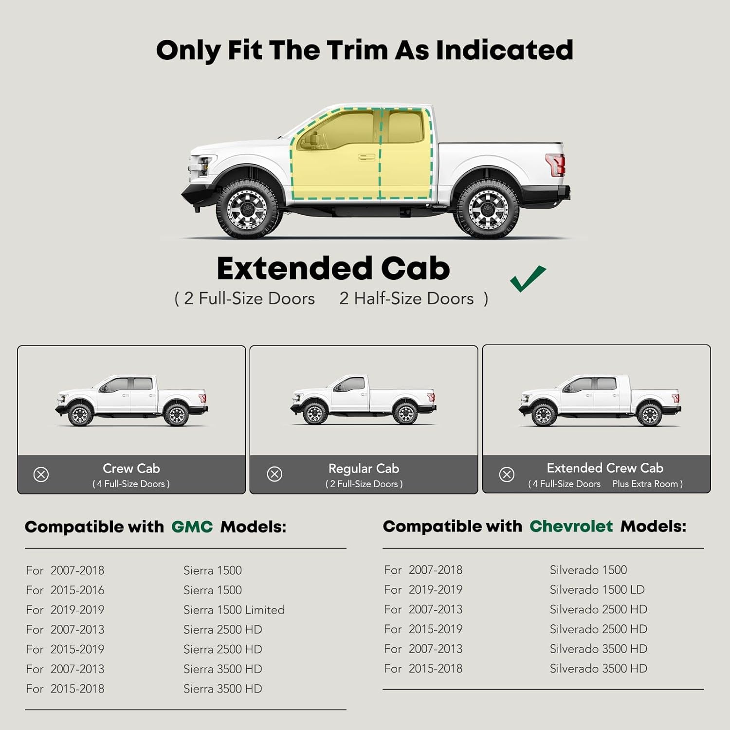 - Confident Fitment: Cab length side steps fits the Chevrolet GMC Models: Silverado/Sierra 1500 07-18, 2500 HD 07-13 15-19, 3500 HD 07-13 15-18, Silverado 1500 LD/Sierra 1500 Limited 19, Silverado 2500 07-18, Extended Cab(2 Full-Size Doors with Half Doors)