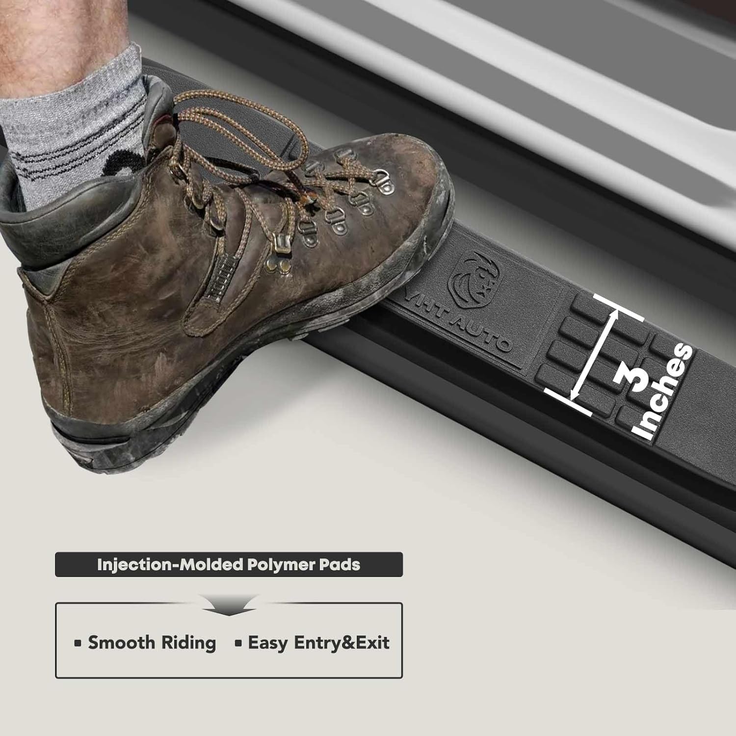 - High-Strength Steel: The step bars are crafted from high-strength Q235A steel and are enhanced with an electrophoretic layer and powder coating. This dual-layer protection greatly improves wear and corrosion resistance, while also imparting a sophisticated appeal
