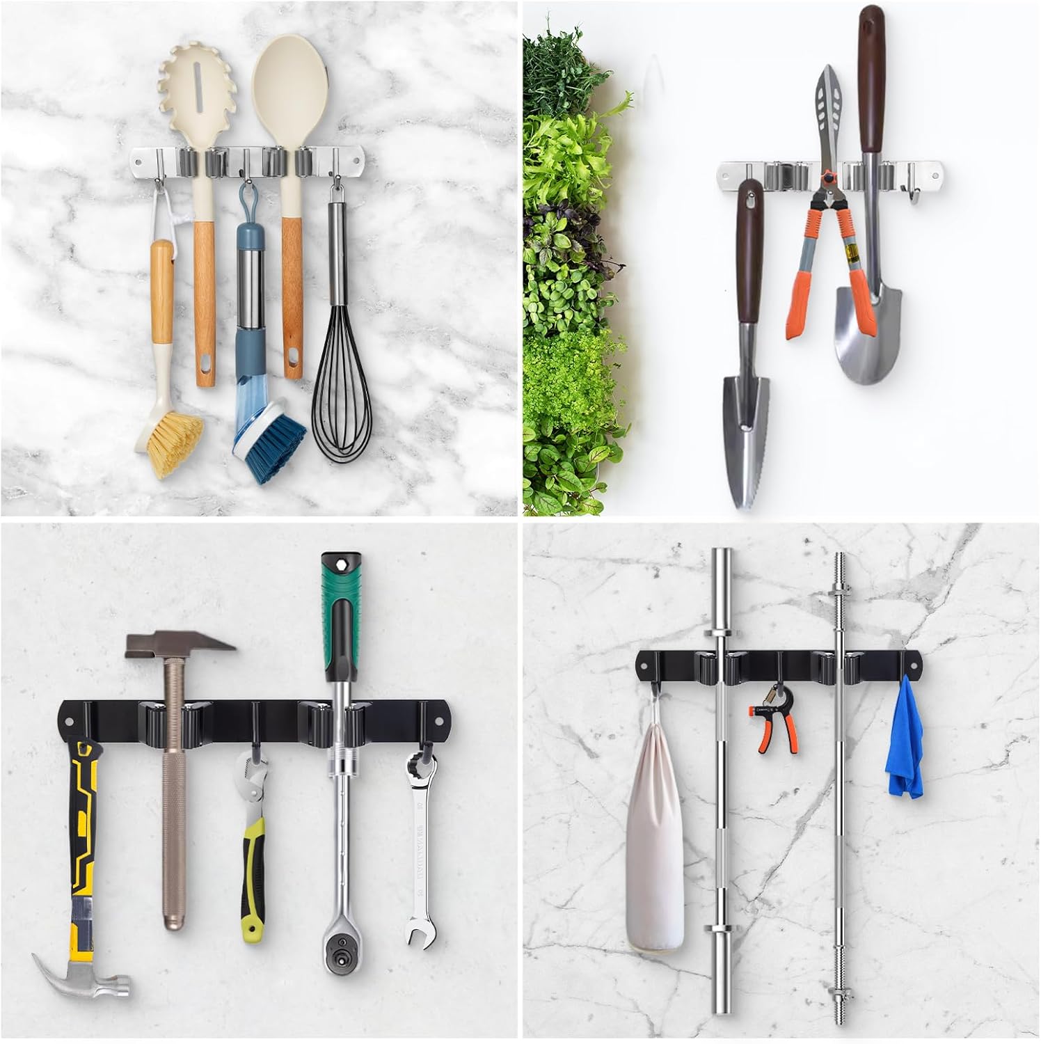 - [Sturdy & Non-slip] The broom and mop holder wall mount with 2 slots and 3 hooks is made of rustproof 304 stainless steel, which is beautiful and much more durable than plastic materials, It's non-slip high elasticity clips can holds your broom, mop, umbrella or other garage tools firmly. You can install the tool storage rack with self-adhesive or screws to mount on the wall.