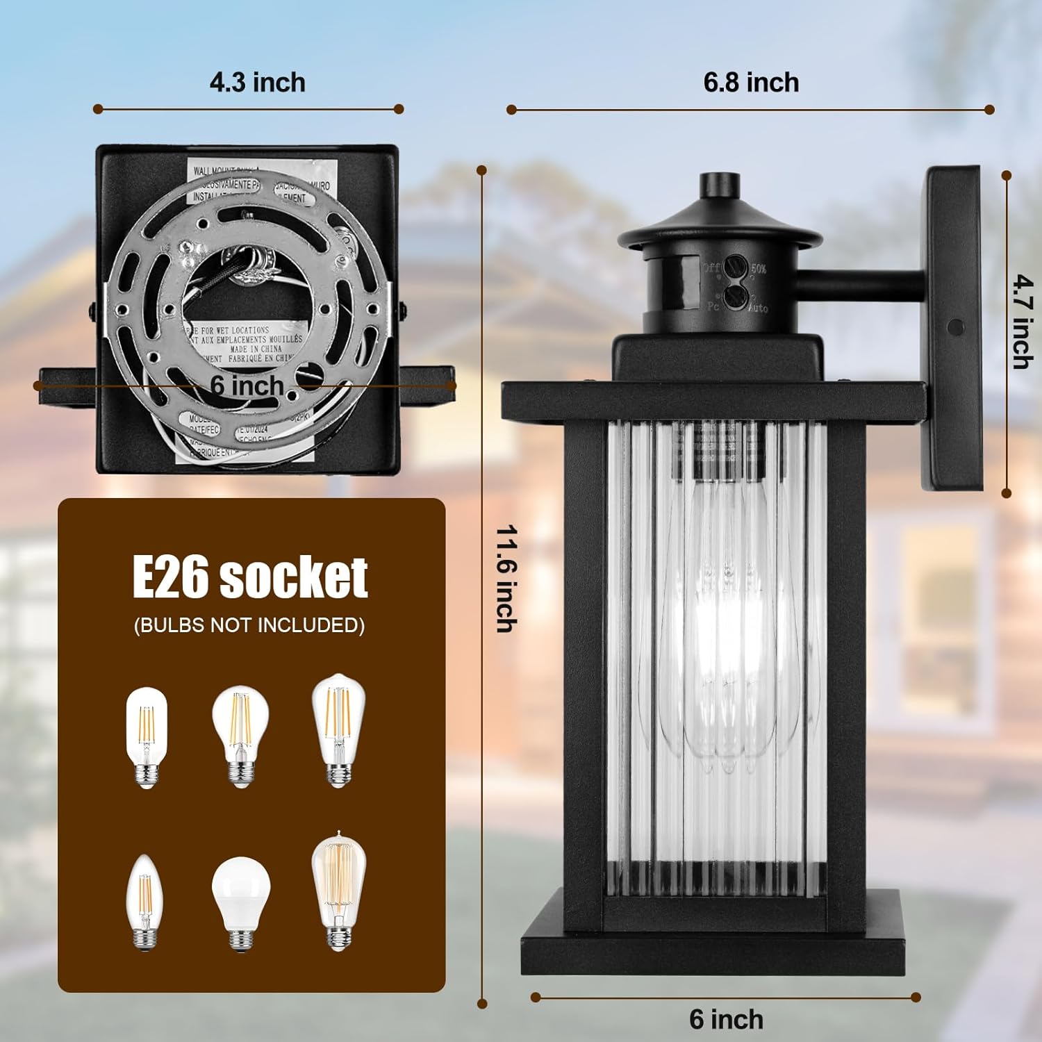 - Bulb Replacement & Compatibility: Designed with user convenience in mind, our dusk to dawn garage exterior lights provides ample space for bulb maintenance. The open-bottom design allows for hassle-free bulb replacement without requiring any tools. The E26 bulb socket is compatible with standard E26 bulbs(bulb not included), please use a dimmable E26 bulb to avoid flicking