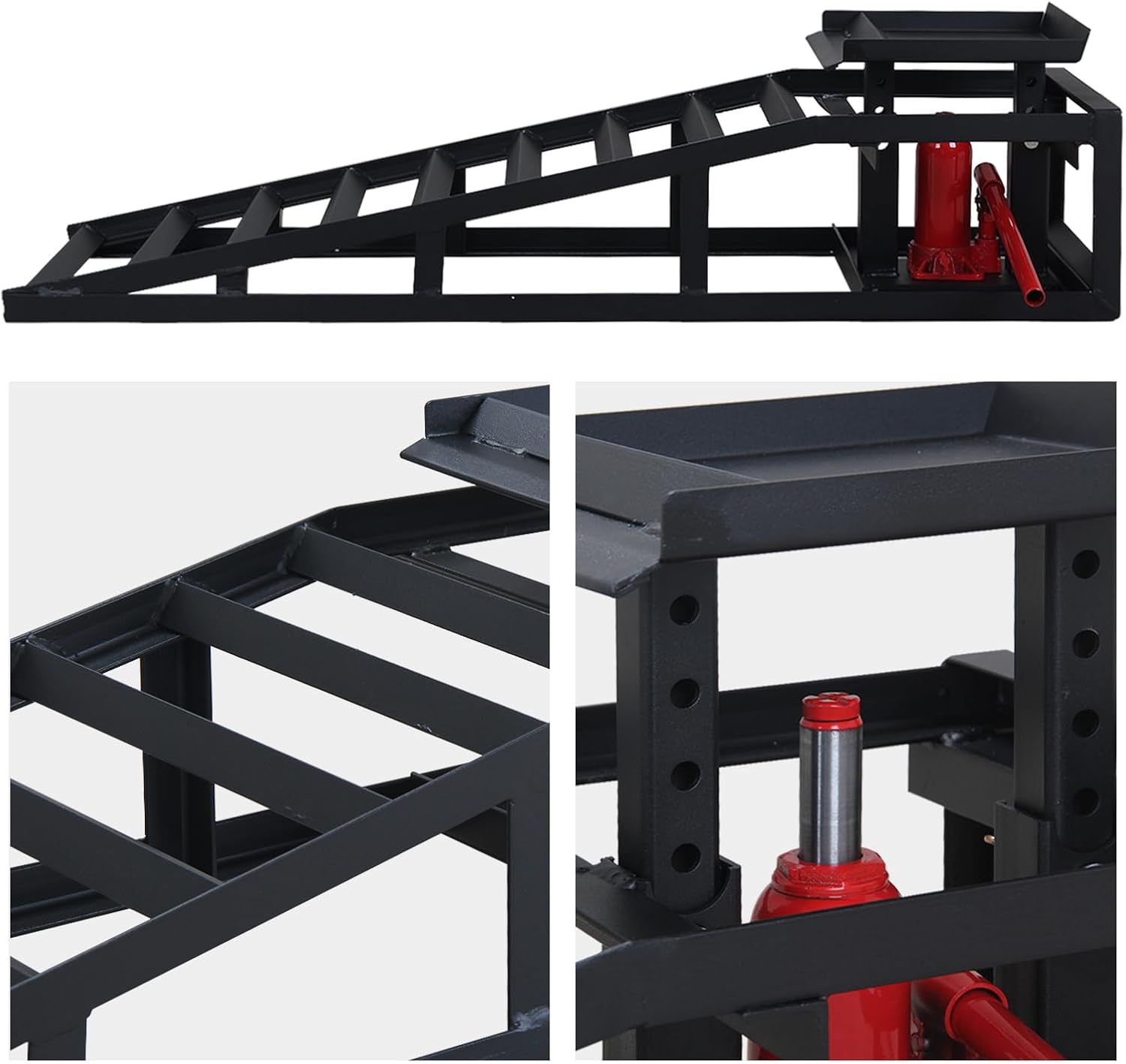 - Thoughtful Design: We considerately provide two handles for convenient controlling the hydraulic jack, and trapezoidal hydraulic ramps are easier to stack and store, and the detachable structure makes them relatively easy to use.