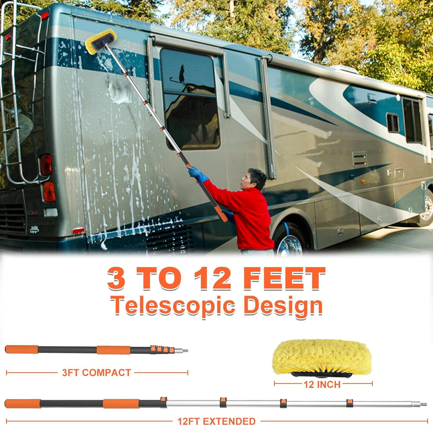- Multi-Size Adjustment - The Car Wash Brush Telescopic Pole has a variety of length modes that can be adjusted to different lengths for different scenarios (36-144 inches), and the high-quality aluminum makes it strong and durable while not only being lightweight, but also preventing it from stretching, bending, or twisting so it can do all the work, making it easy to get your cleaning done.
