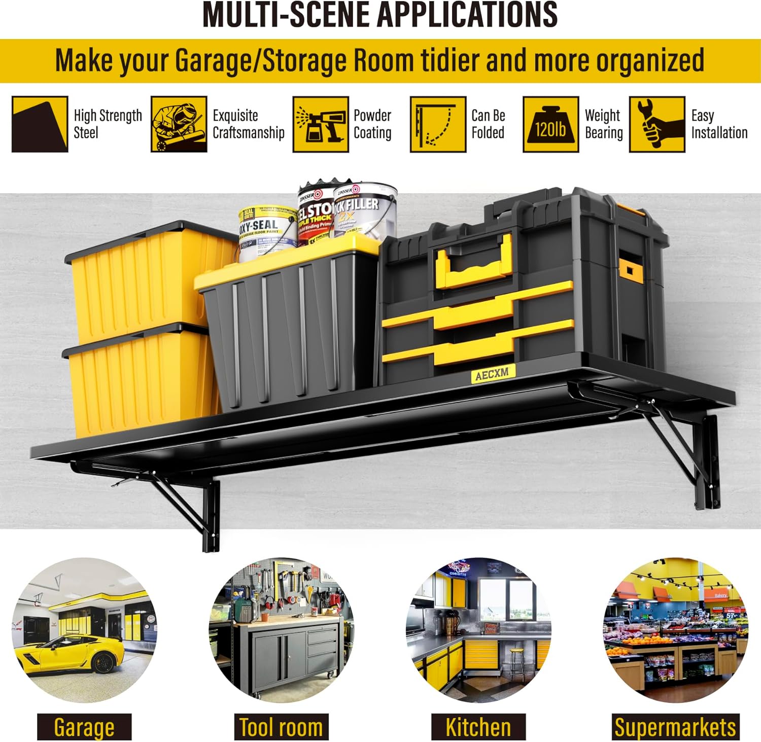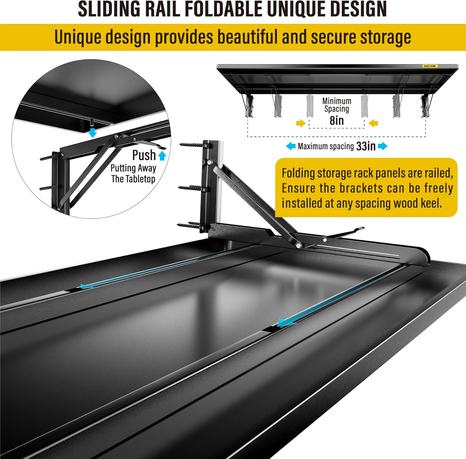 • SUPERIOR DESIGN: The foldable garage storage shelf panel is made of whole steel plate, The surface of matte high temperature powder baking paint, Flat and smooth, Panel with sliding rail design, The bracket can be installed freely in the range of 8"-33" spacing of wood wall keel, And at the same time it adopts folding bracket, Which can be freely stowed away or unfolded