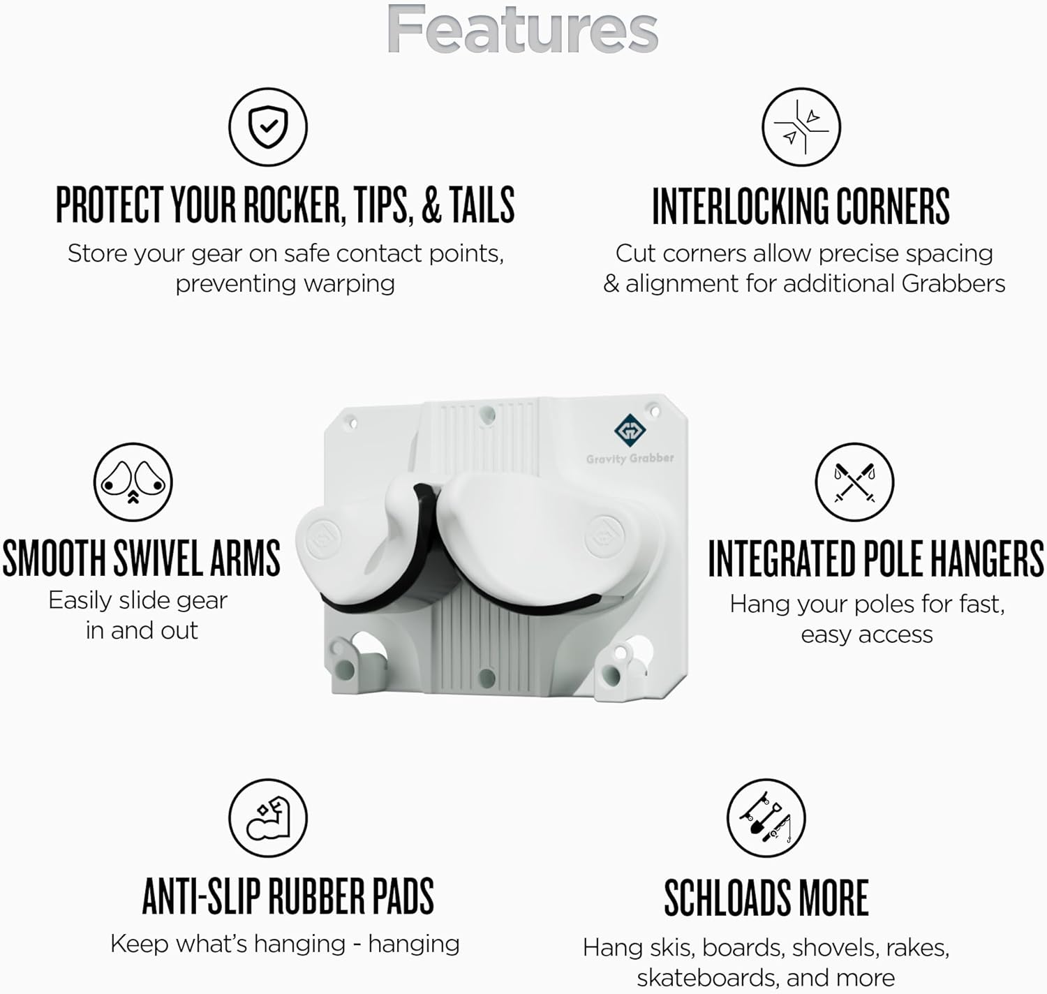 - SECURE YOUR GEAR - With anti-slip pads, keep what's hanging - hanging. Gravity Grabber's gravity-locking design and anti-slip rubber pads give you confidence that your equipment will stay in place. Hang any ski or snowboard, no matter the size, shape, or binding type. From powder to groomer skis, cross country skis, powder to park boards, whatever is hanging - stays hanging.