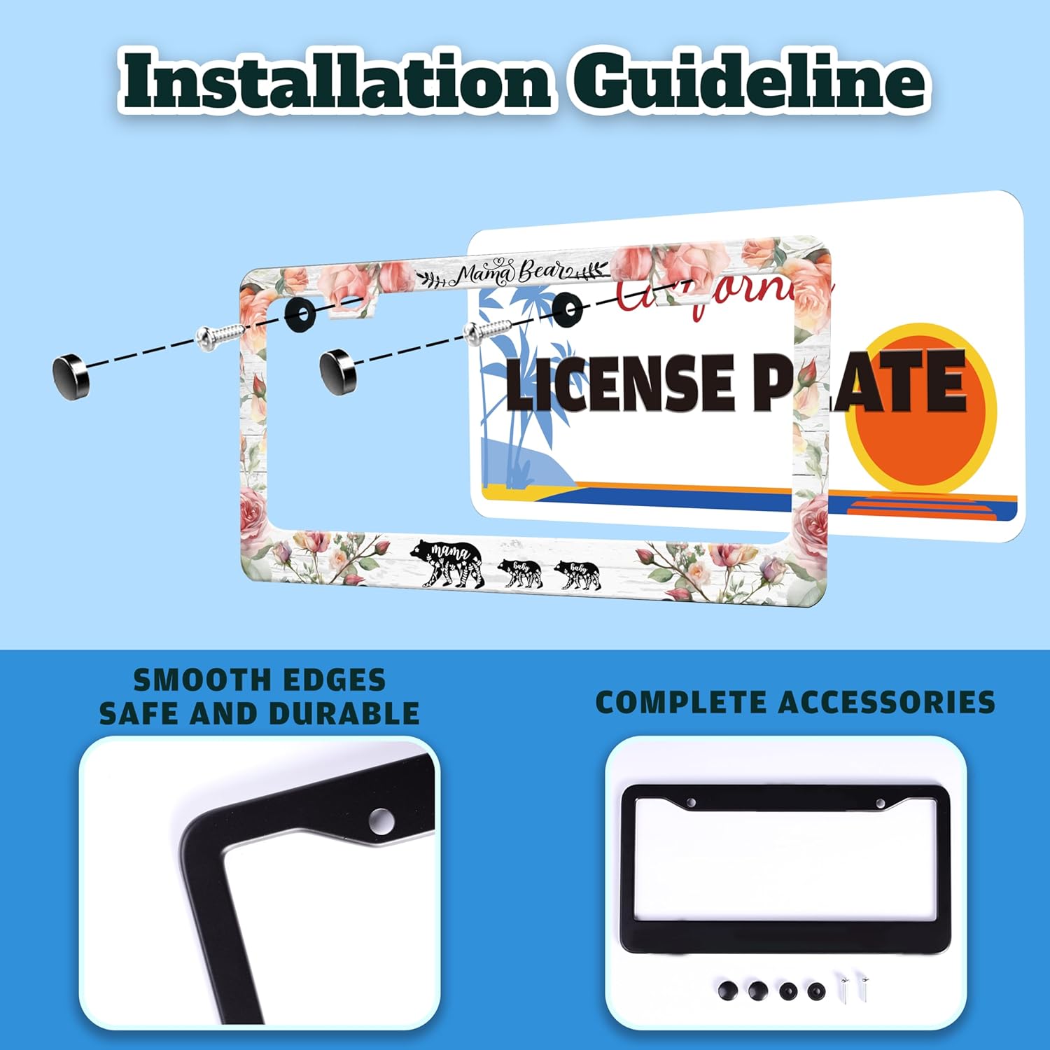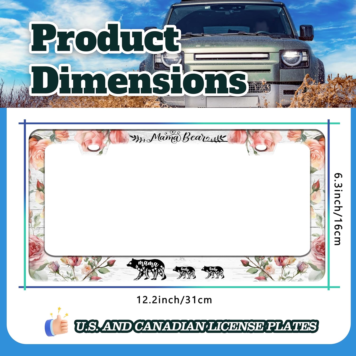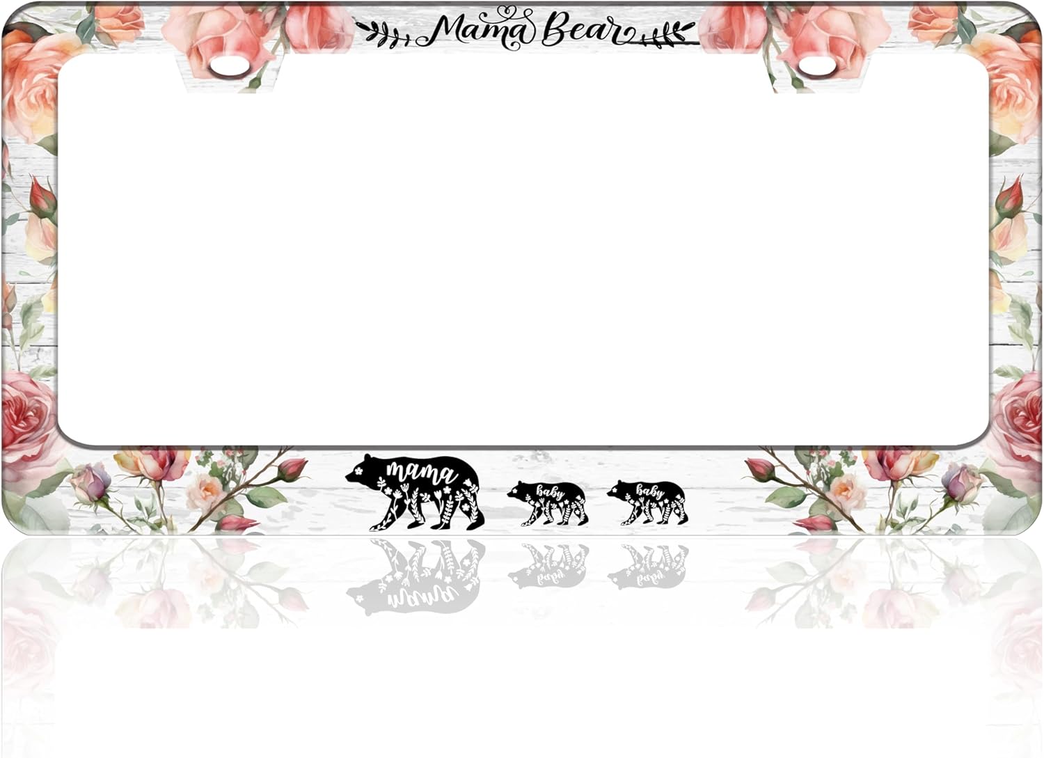 Mama Bear License Plate Frame Beautiful Flowers for Front or Rear Car Tags Stainless Steel License Plate Holder Funny Car Decoration with Screws 6.3 X 12.2 in
