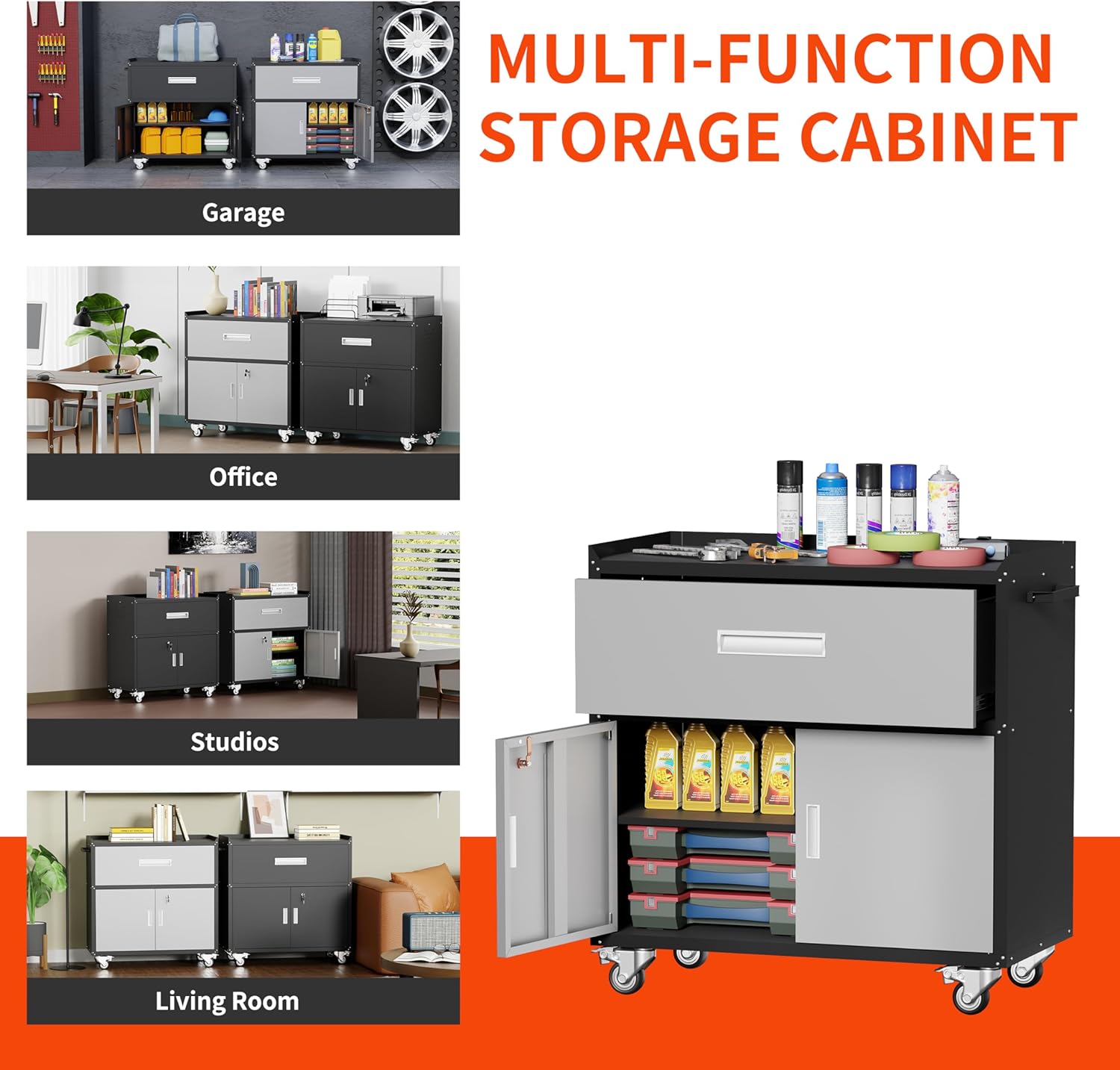 Garage Metal Storage Cabinet for Garage with Adjustable Shelves Wheels, Rolling Tool Chest, Assembly Required, Warehouse, Basement, Tool Room (Gray), Grey