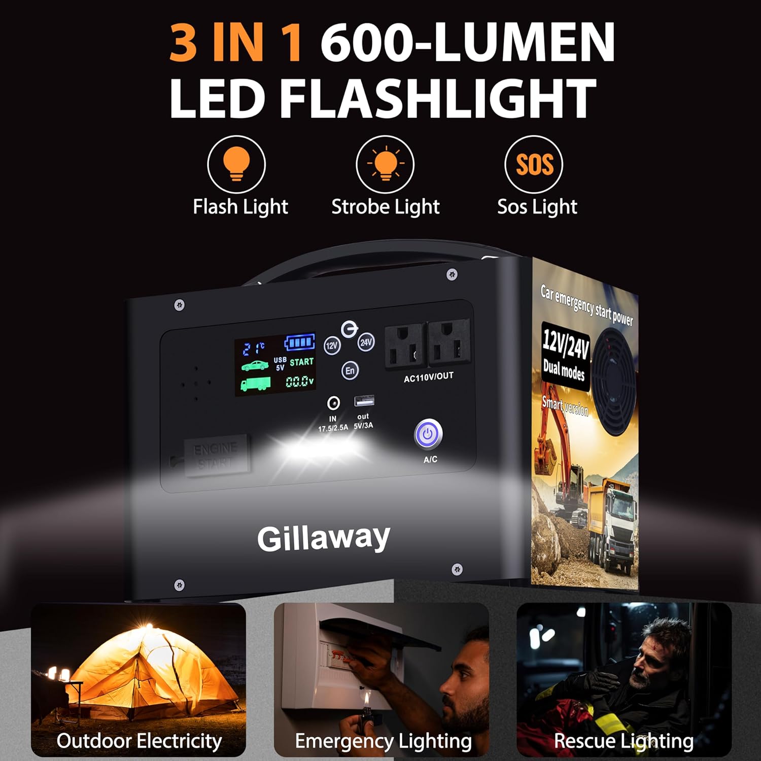 - 【PORTABLE POWER STATION AND LIGHTING FUNCTION】:This car jump starter can also be used as a 155 watt-hour mobile power source. It comes with a 5V/3A output USB port for quick charging of headphones, mobile phones, tablets or other electronic devices. The built-in 600 lumen LED light provides 48 hours of continuous illumination and offers three modes: light, flash and distress.