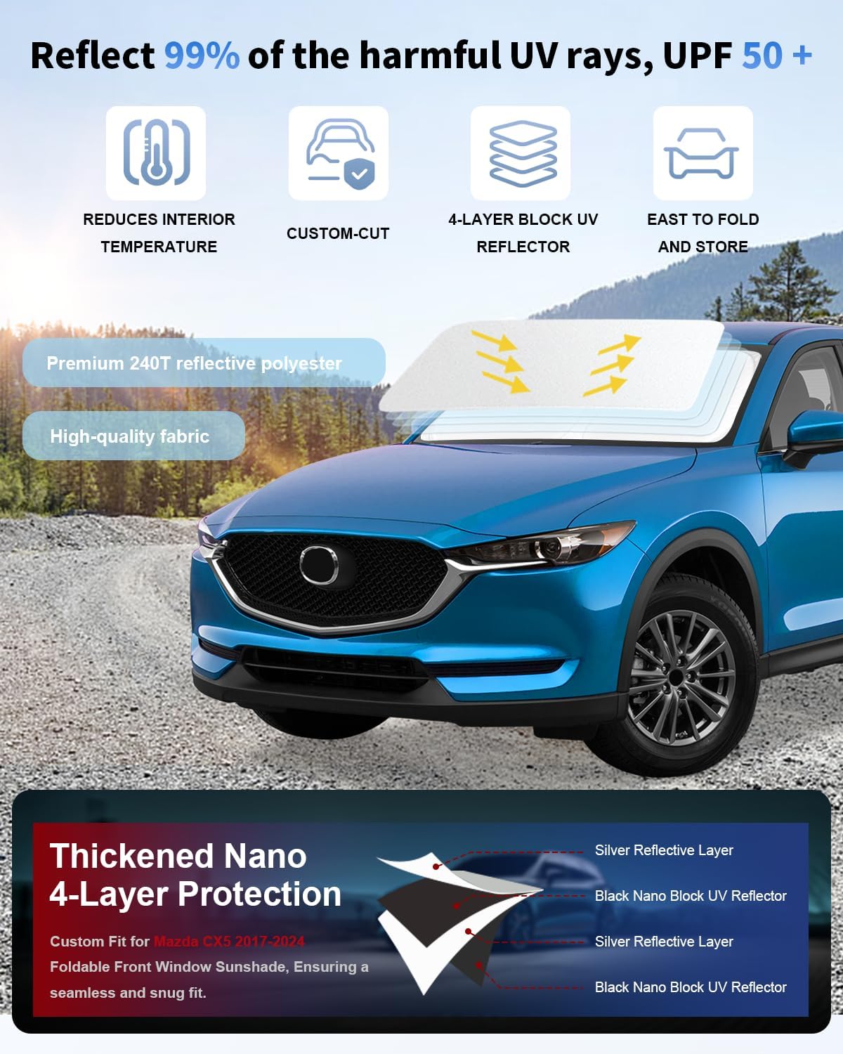 for Mazda CX5 Car Windshield Sunshade for CX-5 2017-2023 2024 2025 Mazda CX5 Accessories Thicken 4-Layer Foldable Car Front Window Sun Shades Cover Block Heat Shield Protector 240T UV Reflector