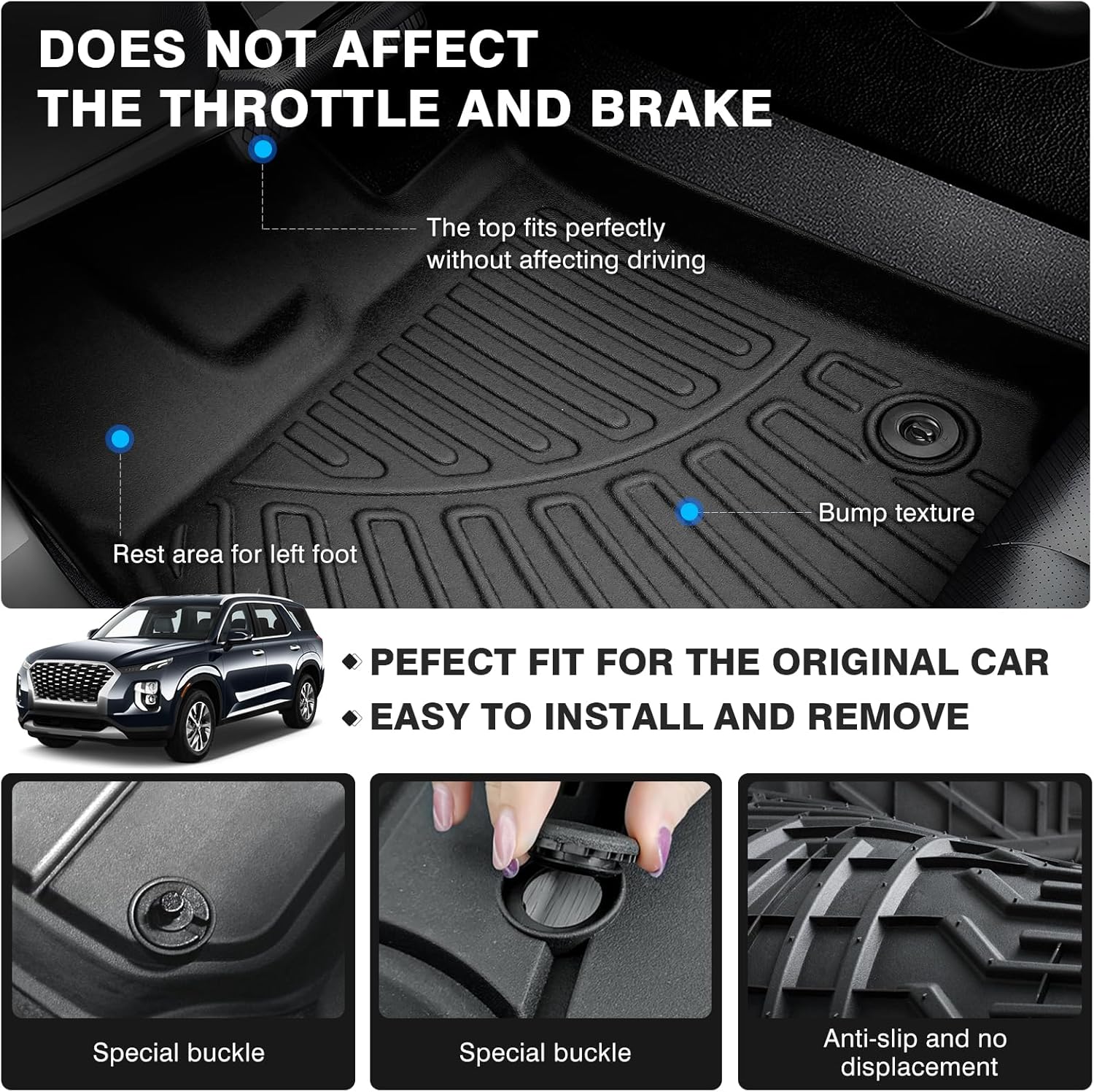 Powerty Floor Mats for 2020-2024 2025 Hyundai Palisade Accessories All Weather Floor Liner 3D TPE 1st & 2nd Row Floor Mat Heavy-Duty Floor Liners