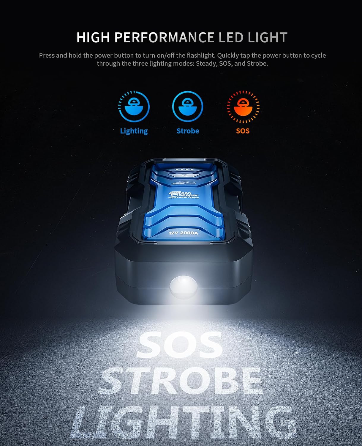 - Emergency Lighting with LED: Beyond its primary function as a [jump starter], the GK-J1202 serves as an emergency light source. It comes with an integrated LED light that includes modes for standard lighting, strobe, and SOS signals, underscoring its utility as a multi-functional portable jump starter for cars.