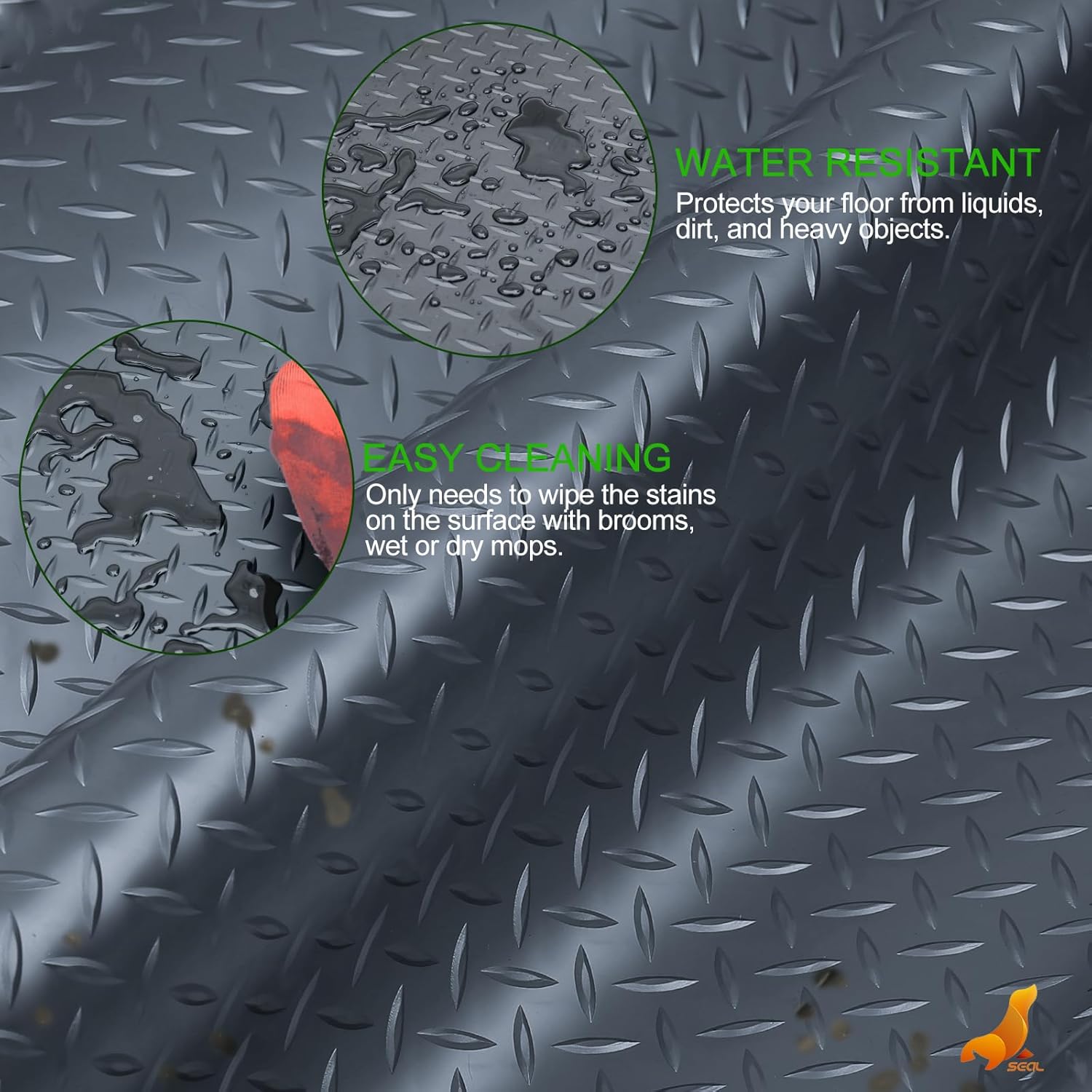 - [Protect Your Floors Like Never Before] - Keep your garage floor looking new with SEAL’s mats. Their special diamond plate design makes sure you won’t slip, giving you a safe way to walk in and out. These mats stop all kinds of damage like scratches and spills from ruining your floors, offering full coverage.