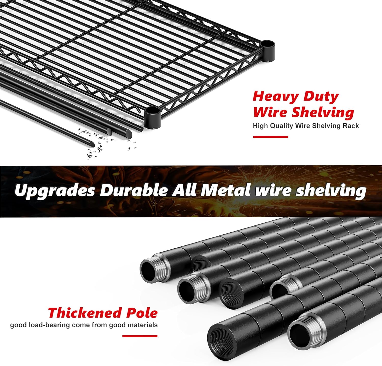 - ă1500 LBS Capacity Super Sturdy Storage ShelvesăThis Metal shelving units and storage made of heavy duty steel wire,and has undergone special coating treatment. Every solid thickened industrial shelving with extra stiffener, can easily bear 300LBS a total of 1500 lbs bearing capacity. which means this garage storage will always be your reliable partner.Perfect for bulk storage in warehouses, retail inventory, schools, offices, or reliable heavy-duty use at home.