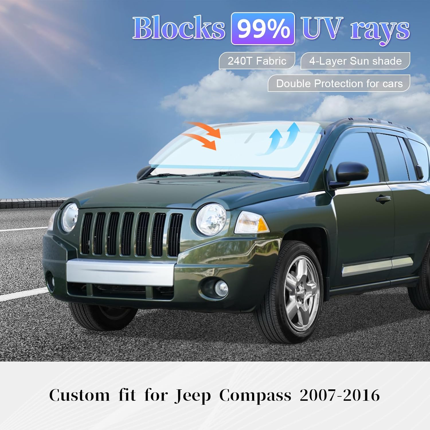 - ăVehicle Specific ăSunshade windshield Custom for Jeep Compass 2007 - 2016 --You've spent too much time in the California and Texas sun, buy it now, Please donât waste time,reject the heat, quality products - Collapsible sun shade can be full covered on windshield and No gap. Fits like a charmïŒ