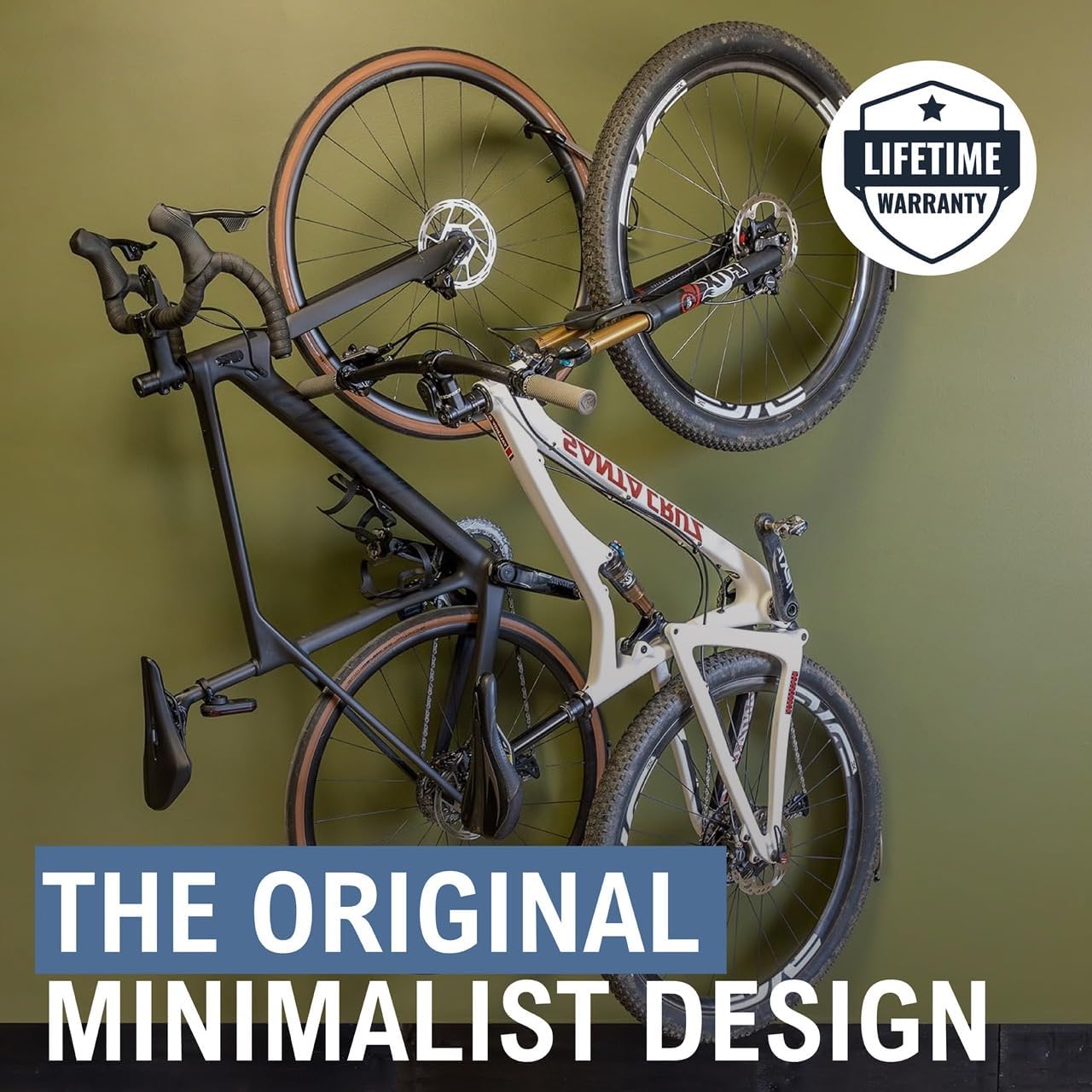 - WALL-MOUNTED BIKE STORAGE – Reclaim your garage, shed, or apartment space with this space-saving vertical bike rack. Designed to mount securely to wall studs, each rack stores one bicycle flat against the wall, making it ideal for indoor bike storage in tight spaces. Compatible with a variety of bikes including road bikes, e-bikes, folding bikes, and more. Fits tires up to 2.6" wide and up to 29" in diameter.